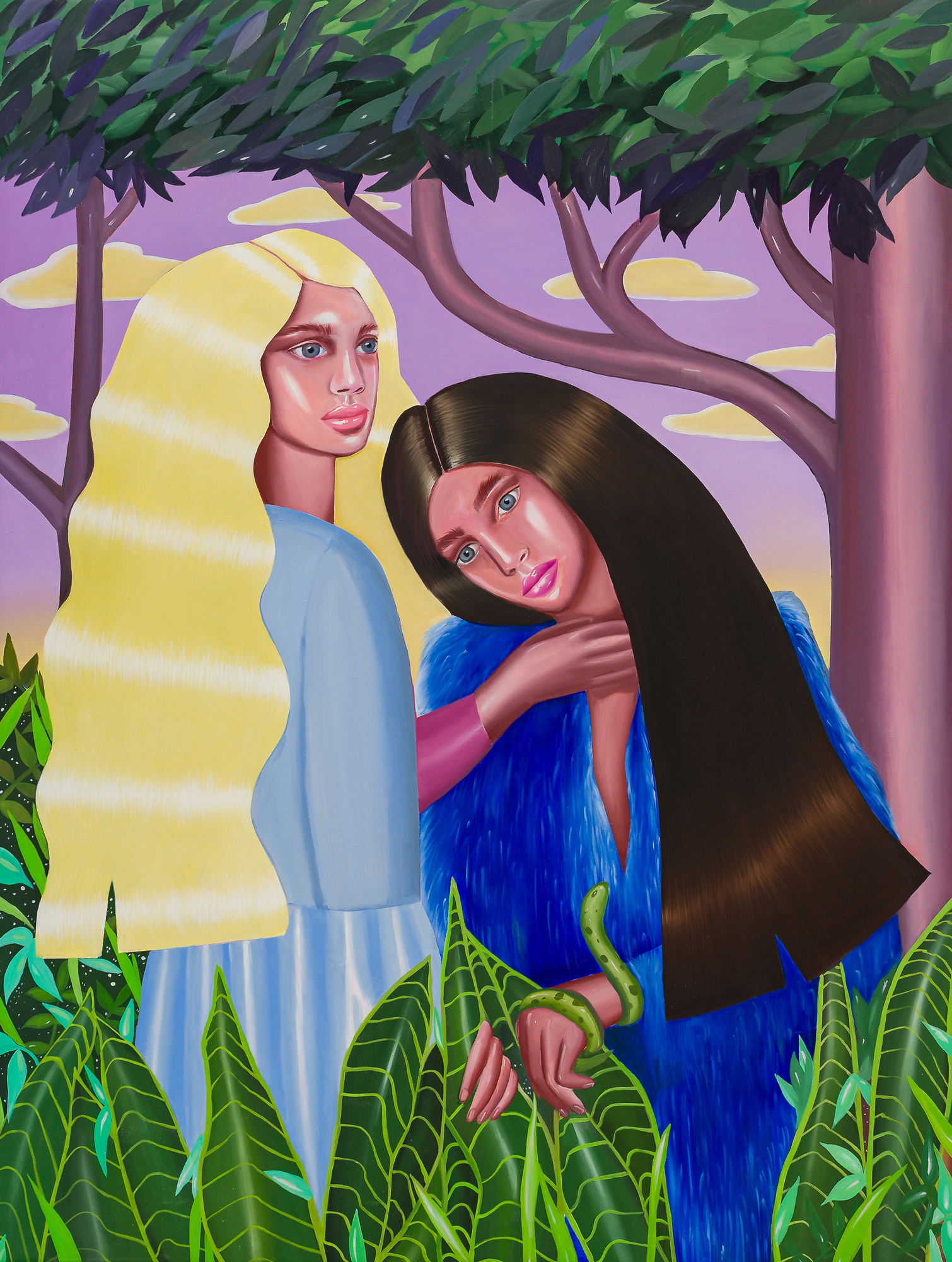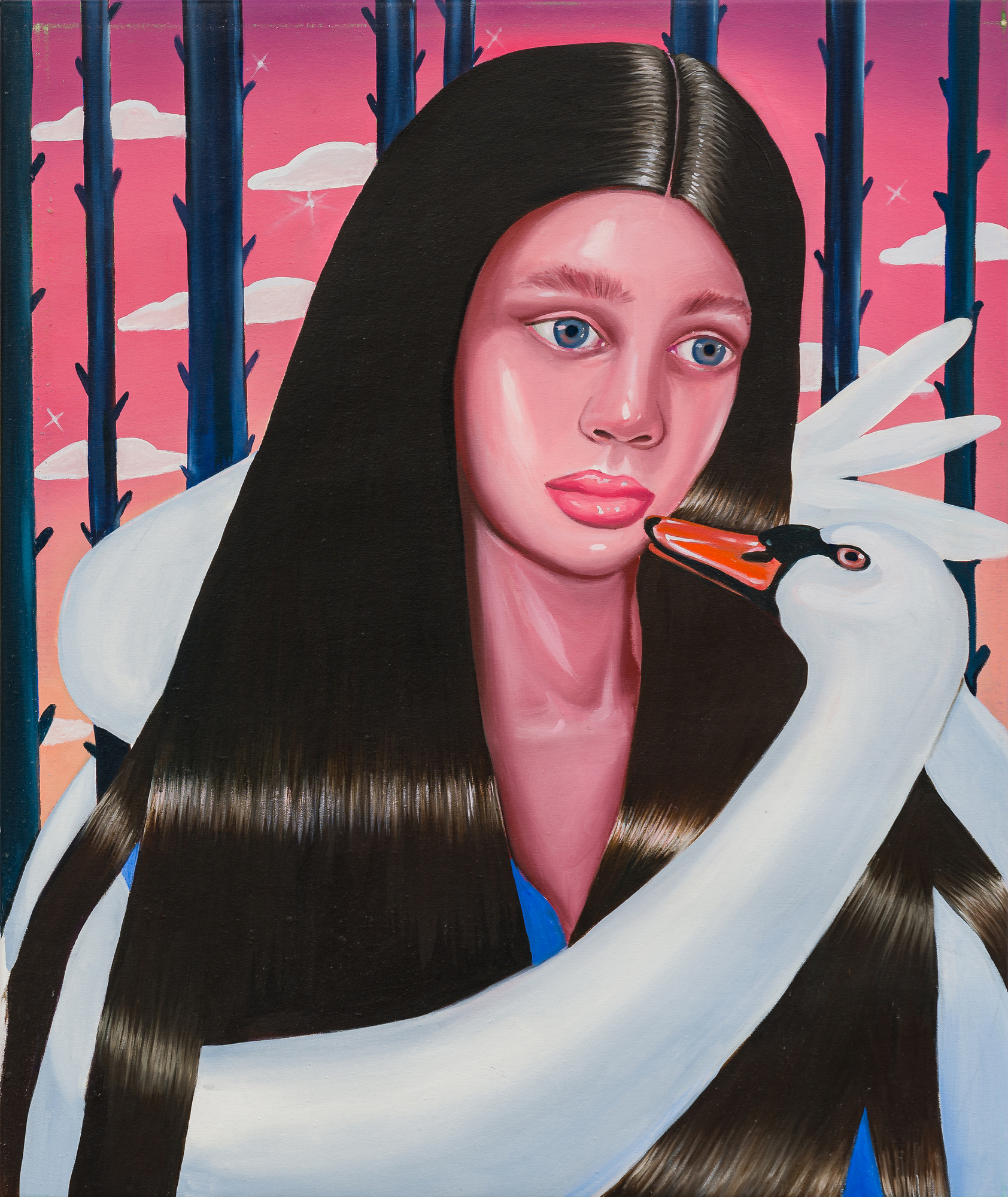 Ioana’s imaginary map thus follows the reverse logic marking the construction of the formation and education novel – the Bildungsroman – whether literary or visual. If, in the Bildungsroman, the main character discovers the unknown and learns to manage the surrounding reality by developing new skills, while following a linear narrative path with a beginning and an ending, in Ioana Băltan’s series, he rediscovers the once-known-now-forgotten by being confronted with childhood sequences subject to the non-logic of emotional memory. The linearity of the narrative is thus pulverized into slivers of memories randomly developed on large surfaces, rendered in oil on canvas. The viewer is served slices of the artist’s emotional archives, the archives of that illo tempore perfectly preserved beneath the flesh of the plastic dolls in the foreground. Ioana Băltan increases the light of her compositions by juxtaposing desaturated and saturated tones. Neapolitan yellow, strontium yellow or thalo crimson pinks gain a high value index in the company of cobalt blue, magenta violet and China green. The rhythm of surfaces worked in ultra-saturated orange tones with burnt shadows and green tones transforms some compositions from static-representational to dynamic-narrative, portraying to viewers doll-like characters in motion. Unexpectedly, the plastic fairies seem to move, thanks to the chromatic associations expressed by the artist. The characters’ broad gestures, the exaltation of flesh through the layering of glaze and the artist’s choice of the generic portrait with exaggerated facial features are all typical manifestations of the dominant Cartoon Glam gene altered by the icon-signs of hyper-feminine aesthetics. A Barbie world conquering the fantasy realms of childhood emerges in shots that look like Instagram selfies. The artist’s careful attention to rendering hair volume by applying thin, elongated and calm brush strokes, as well as the manner in which the garments are treated in subtly textured pastel tones, amplify the femininity of the characters depicted. All the canvases thus become feminine, gaining the quality of frames that are witnesses to the defiance of heteronormative norms and transforming the paintings into a series of confessions of the auctorial ego. Ioana Băltan’s messages go beyond the aestheticization of dolls taking selfies while eating cakes, wearing make-up or riding fluffy unicorns in a flying gallop, and aim at exposing the excessive fetishization of female bodies, a fetishization that starts in early childhood and drives a whole cluster of consumer goods industries, be they toys, pastries, cosmetics or Instagram reels. Text written by Gilda Ghinoiu, curator