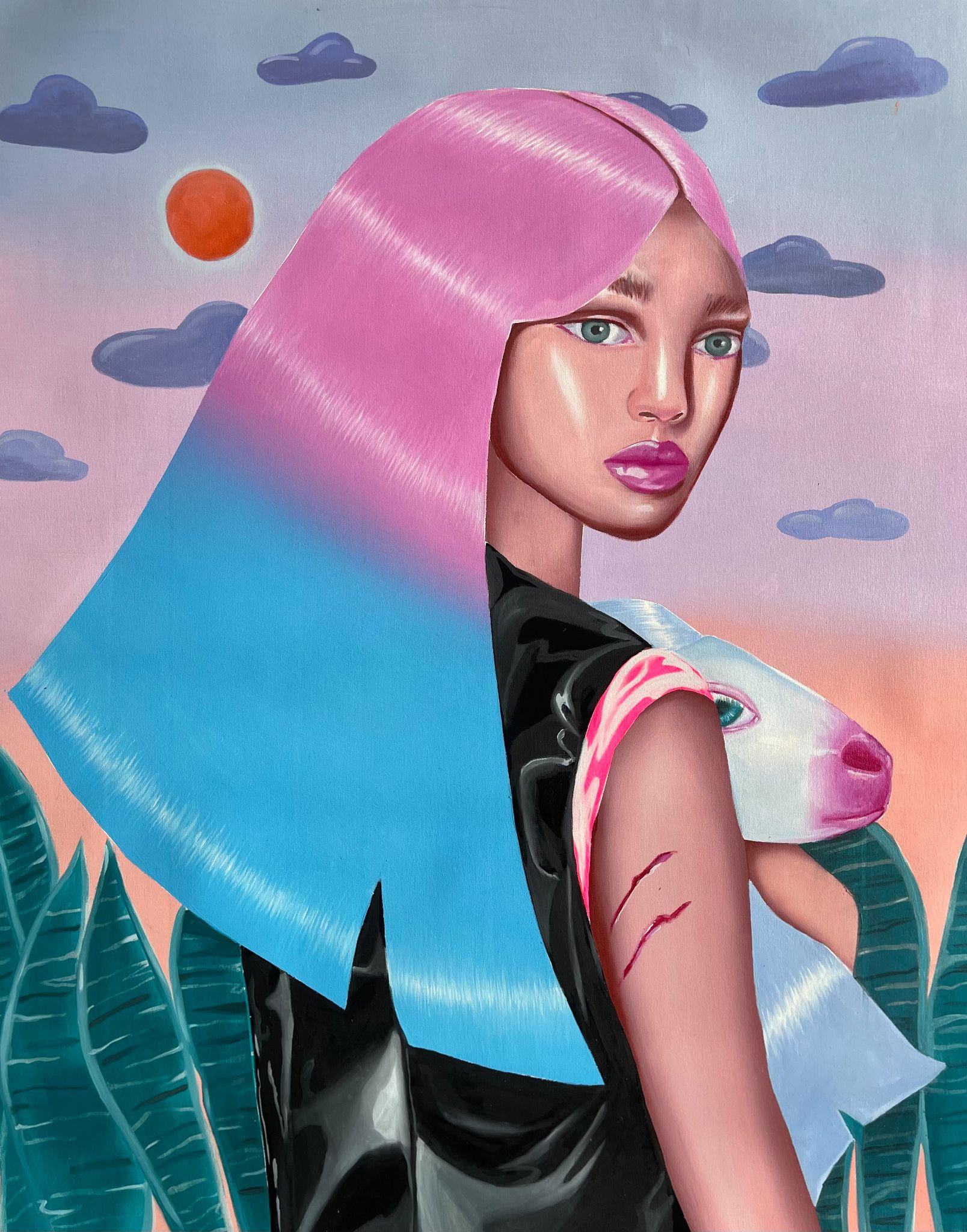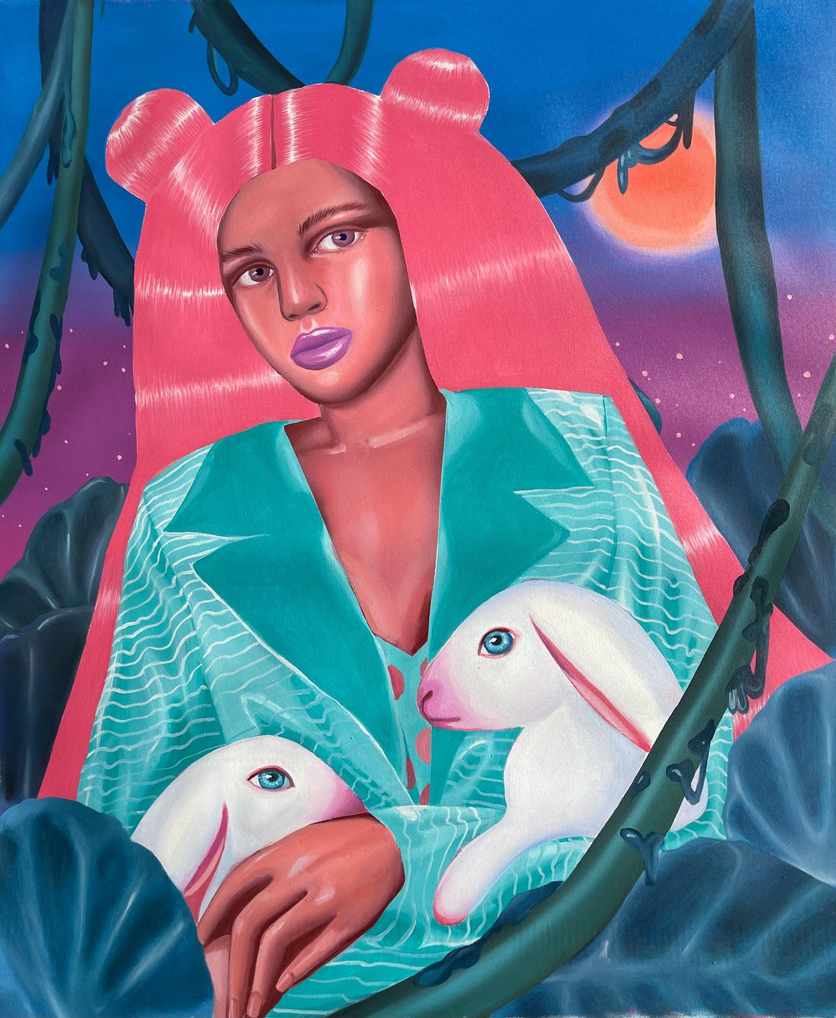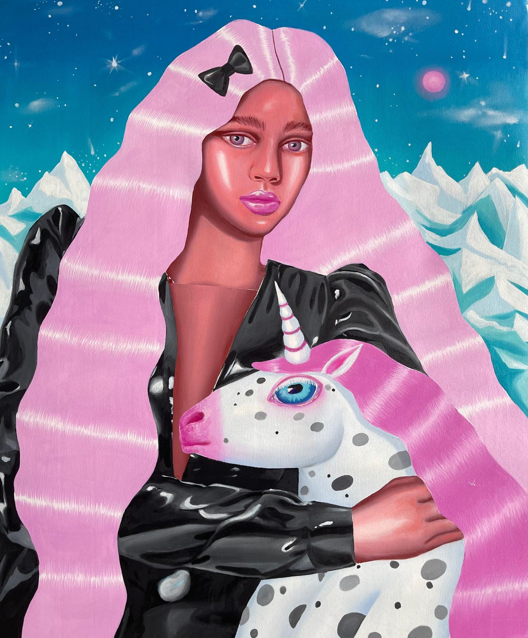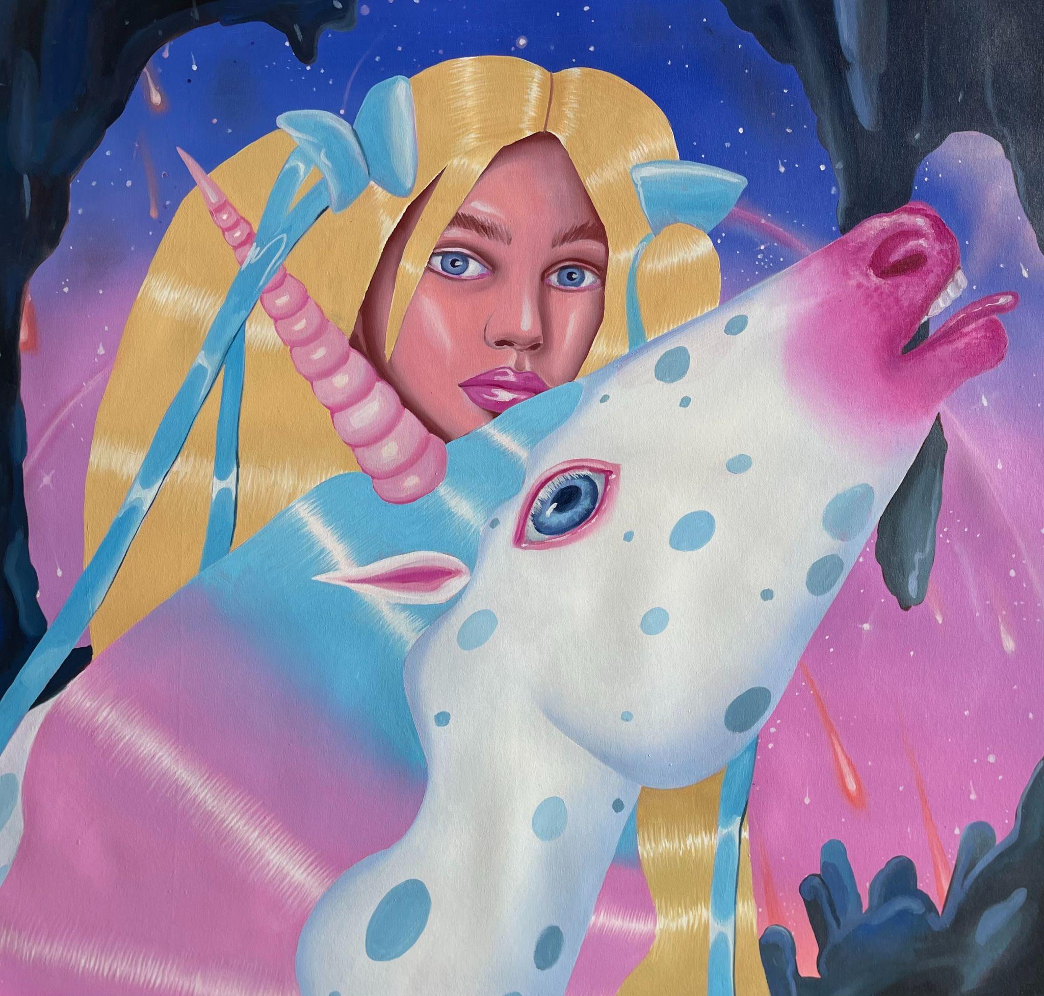 Using composition rules specific to the Cartoon Glam movement, in which the human figure dominates the surface of representation, Ioana Băltan creates, through pictorial means, a guide to revisiting the memory of childhood, in the economy of which she first isolates elements with a symbolic charge – a unicorn, a lollipop, a bunny – then organizes them into visual ecosystems governed by the laws of hyper-feminine aesthetics.
