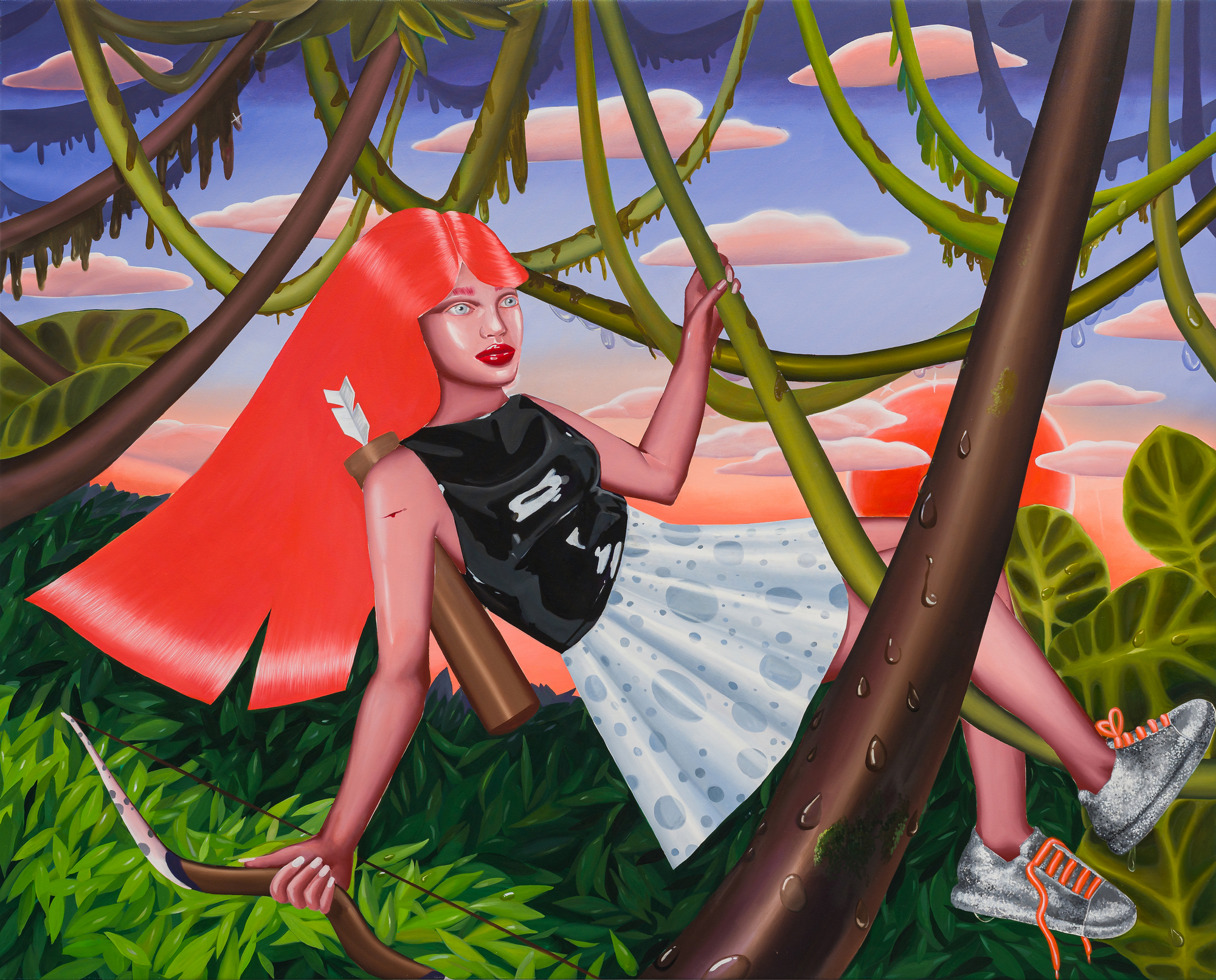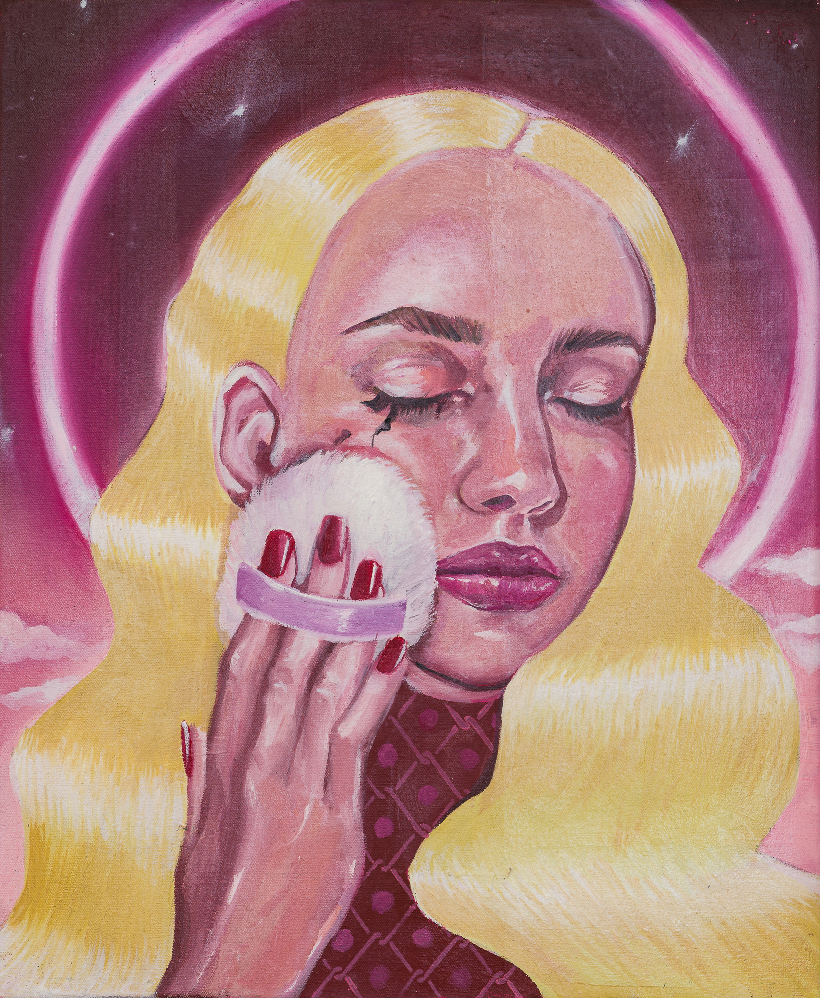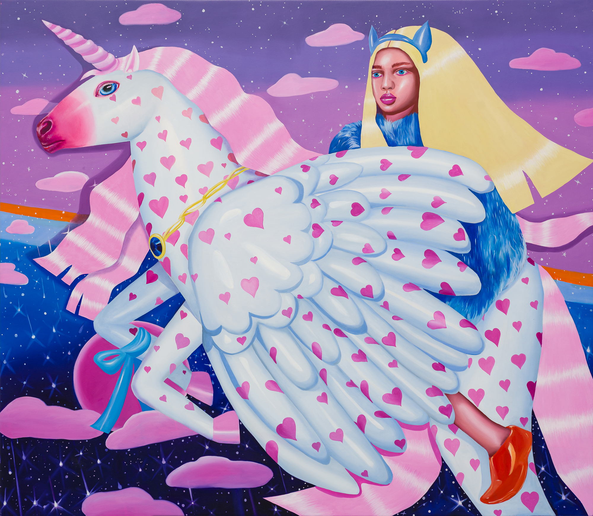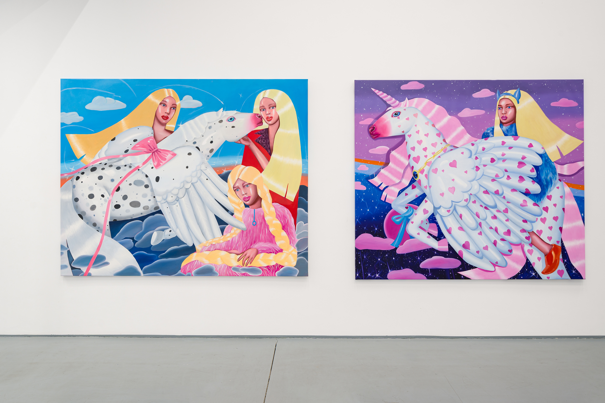 Using composition rules specific to the Cartoon Glam movement, in which the human figure dominates the surface of representation, Ioana Băltan creates, through pictorial means, a guide to revisiting the memory of childhood, in the economy of which she first isolates elements with a symbolic charge – a unicorn, a lollipop, a bunny – then organizes them into visual ecosystems governed by the laws of hyper-feminine aesthetics.