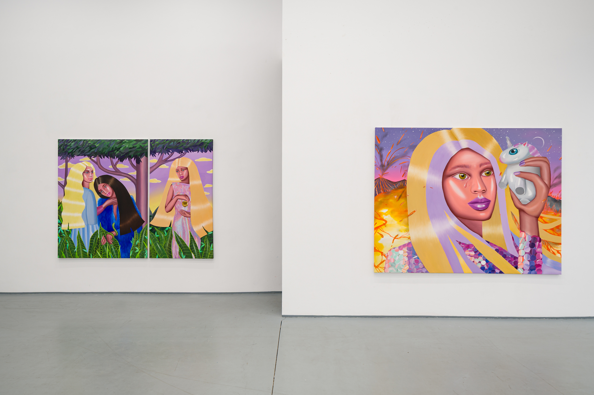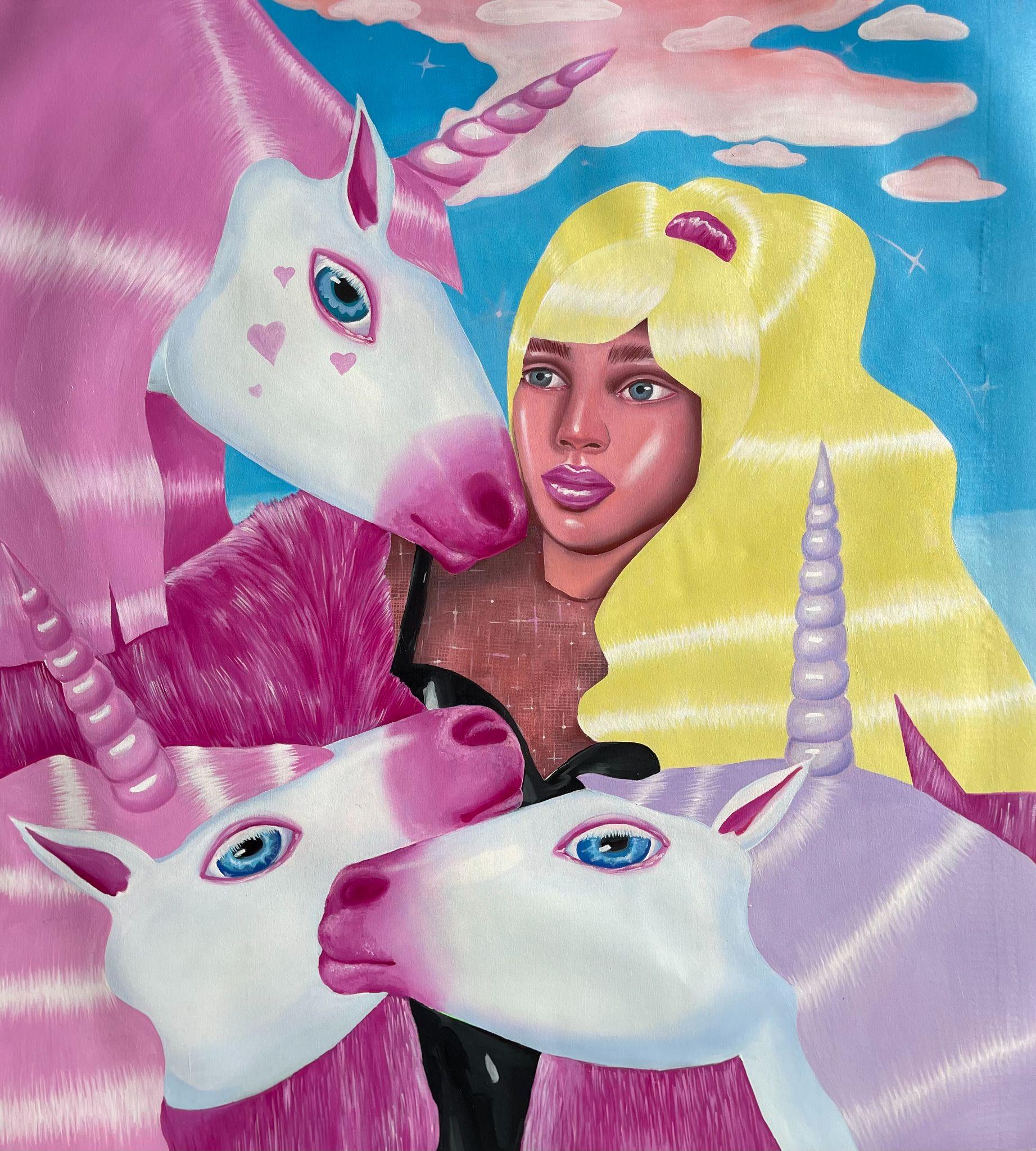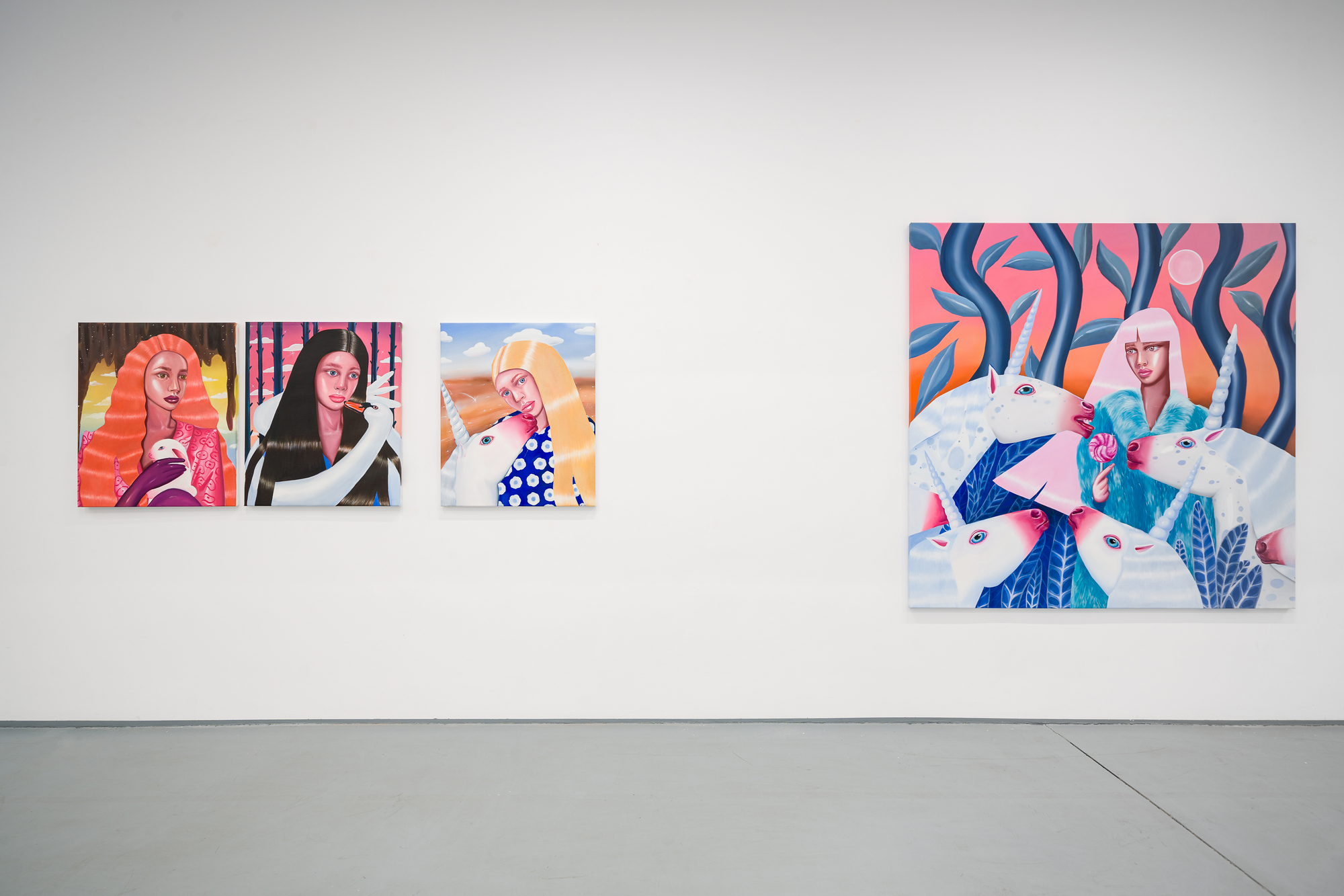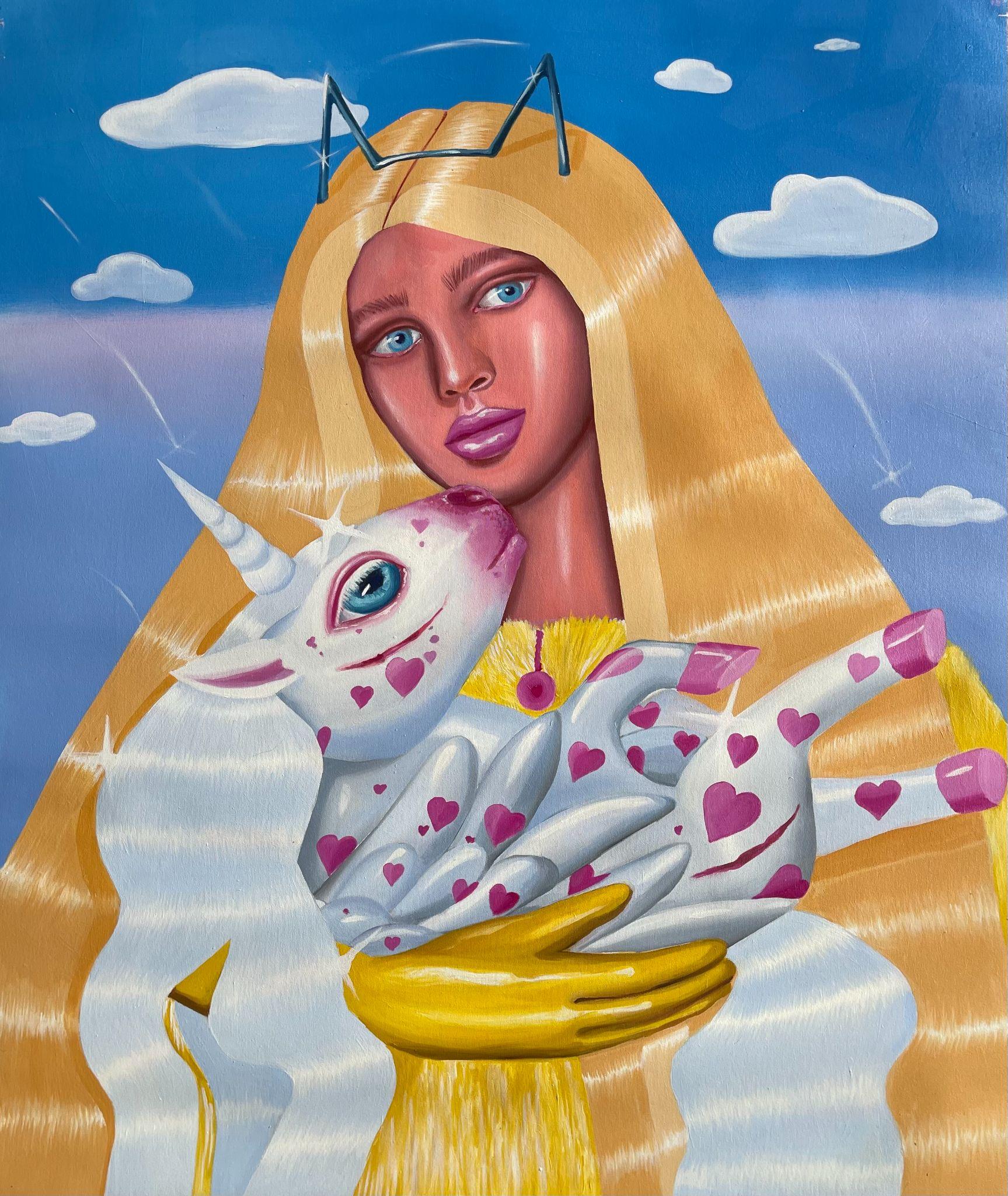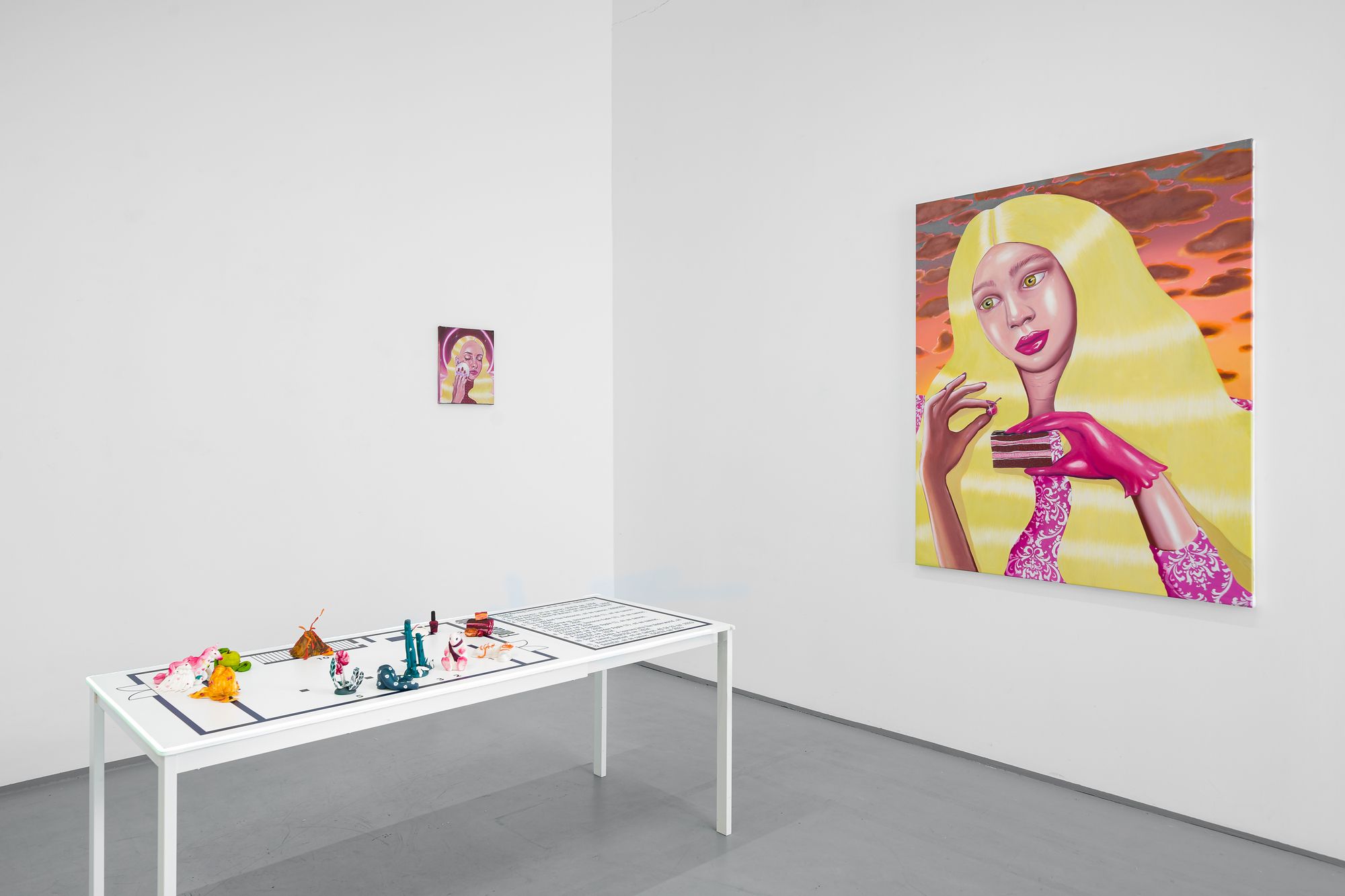 Ioana’s imaginary map thus follows the reverse logic marking the construction of the formation and education novel – the Bildungsroman – whether literary or visual. If, in the Bildungsroman, the main character discovers the unknown and learns to manage the surrounding reality by developing new skills, while following a linear narrative path with a beginning and an ending, in Ioana Băltan’s series, he rediscovers the once-known-now-forgotten by being confronted with childhood sequences subject to the non-logic of emotional memory. The linearity of the narrative is thus pulverized into slivers of memories randomly developed on large surfaces, rendered in oil on canvas. The viewer is served slices of the artist’s emotional archives, the archives of that illo tempore perfectly preserved beneath the flesh of the plastic dolls in the foreground. Ioana Băltan increases the light of her compositions by juxtaposing desaturated and saturated tones. Neapolitan yellow, strontium yellow or thalo crimson pinks gain a high value index in the company of cobalt blue, magenta violet and China green. The rhythm of surfaces worked in ultra-saturated orange tones with burnt shadows and green tones transforms some compositions from static-representational to dynamic-narrative, portraying to viewers doll-like characters in motion. Unexpectedly, the plastic fairies seem to move, thanks to the chromatic associations expressed by the artist. The characters’ broad gestures, the exaltation of flesh through the layering of glaze and the artist’s choice of the generic portrait with exaggerated facial features are all typical manifestations of the dominant Cartoon Glam gene altered by the icon-signs of hyper-feminine aesthetics. A Barbie world conquering the fantasy realms of childhood emerges in shots that look like Instagram selfies. The artist’s careful attention to rendering hair volume by applying thin, elongated and calm brush strokes, as well as the manner in which the garments are treated in subtly textured pastel tones, amplify the femininity of the characters depicted. All the canvases thus become feminine, gaining the quality of frames that are witnesses to the defiance of heteronormative norms and transforming the paintings into a series of confessions of the auctorial ego. Ioana Băltan’s messages go beyond the aestheticization of dolls taking selfies while eating cakes, wearing make-up or riding fluffy unicorns in a flying gallop, and aim at exposing the excessive fetishization of female bodies, a fetishization that starts in early childhood and drives a whole cluster of consumer goods industries, be they toys, pastries, cosmetics or Instagram reels. Text written by Gilda Ghinoiu, curator