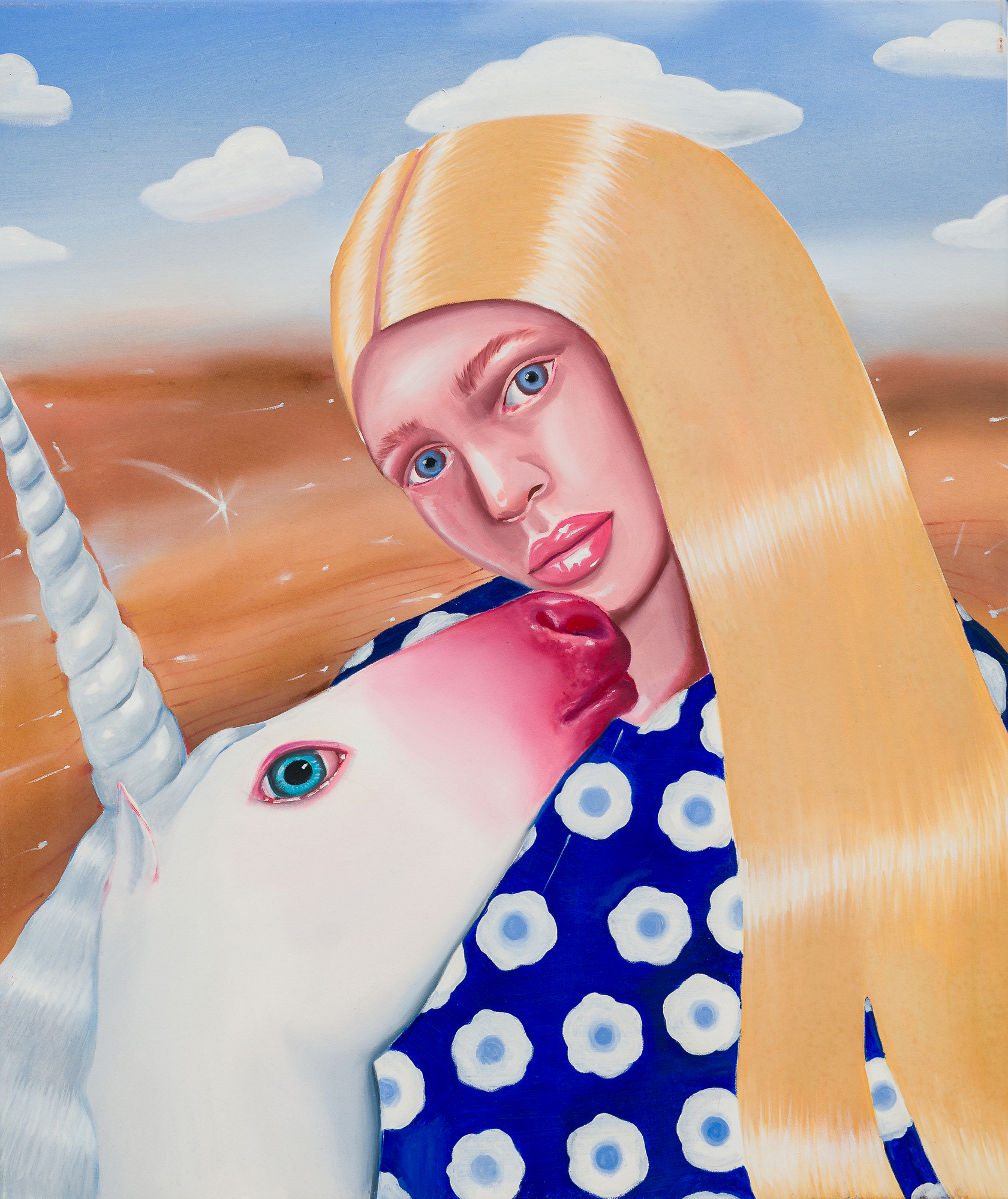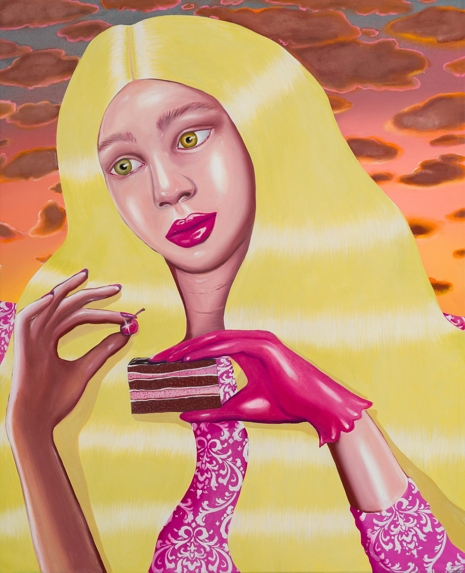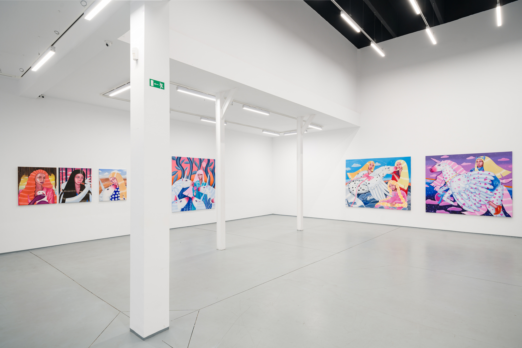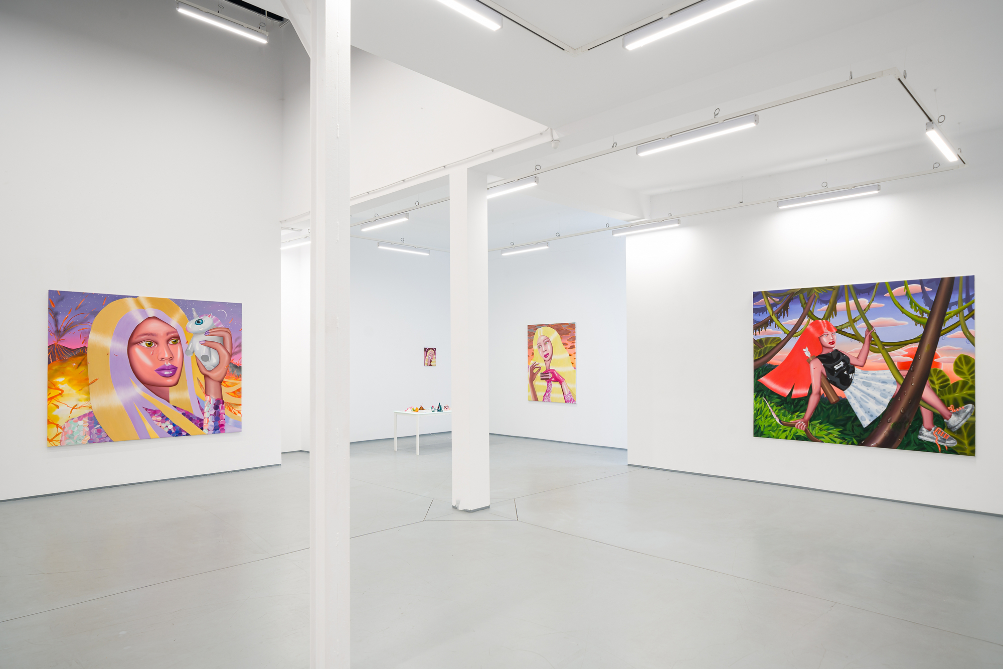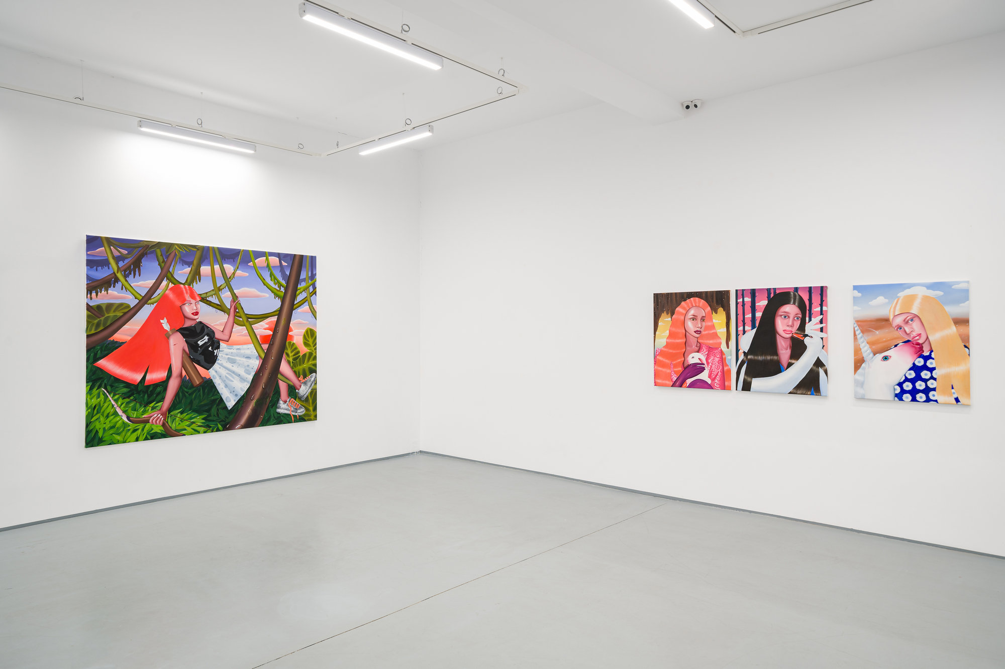 Ioana’s imaginary map thus follows the reverse logic marking the construction of the formation and education novel – the Bildungsroman – whether literary or visual. If, in the Bildungsroman, the main character discovers the unknown and learns to manage the surrounding reality by developing new skills, while following a linear narrative path with a beginning and an ending, in Ioana Băltan’s series, he rediscovers the once-known-now-forgotten by being confronted with childhood sequences subject to the non-logic of emotional memory. The linearity of the narrative is thus pulverized into slivers of memories randomly developed on large surfaces, rendered in oil on canvas. The viewer is served slices of the artist’s emotional archives, the archives of that illo tempore perfectly preserved beneath the flesh of the plastic dolls in the foreground. Ioana Băltan increases the light of her compositions by juxtaposing desaturated and saturated tones. Neapolitan yellow, strontium yellow or thalo crimson pinks gain a high value index in the company of cobalt blue, magenta violet and China green. The rhythm of surfaces worked in ultra-saturated orange tones with burnt shadows and green tones transforms some compositions from static-representational to dynamic-narrative, portraying to viewers doll-like characters in motion. Unexpectedly, the plastic fairies seem to move, thanks to the chromatic associations expressed by the artist. The characters’ broad gestures, the exaltation of flesh through the layering of glaze and the artist’s choice of the generic portrait with exaggerated facial features are all typical manifestations of the dominant Cartoon Glam gene altered by the icon-signs of hyper-feminine aesthetics. A Barbie world conquering the fantasy realms of childhood emerges in shots that look like Instagram selfies. The artist’s careful attention to rendering hair volume by applying thin, elongated and calm brush strokes, as well as the manner in which the garments are treated in subtly textured pastel tones, amplify the femininity of the characters depicted. All the canvases thus become feminine, gaining the quality of frames that are witnesses to the defiance of heteronormative norms and transforming the paintings into a series of confessions of the auctorial ego. Ioana Băltan’s messages go beyond the aestheticization of dolls taking selfies while eating cakes, wearing make-up or riding fluffy unicorns in a flying gallop, and aim at exposing the excessive fetishization of female bodies, a fetishization that starts in early childhood and drives a whole cluster of consumer goods industries, be they toys, pastries, cosmetics or Instagram reels. Text written by Gilda Ghinoiu, curator