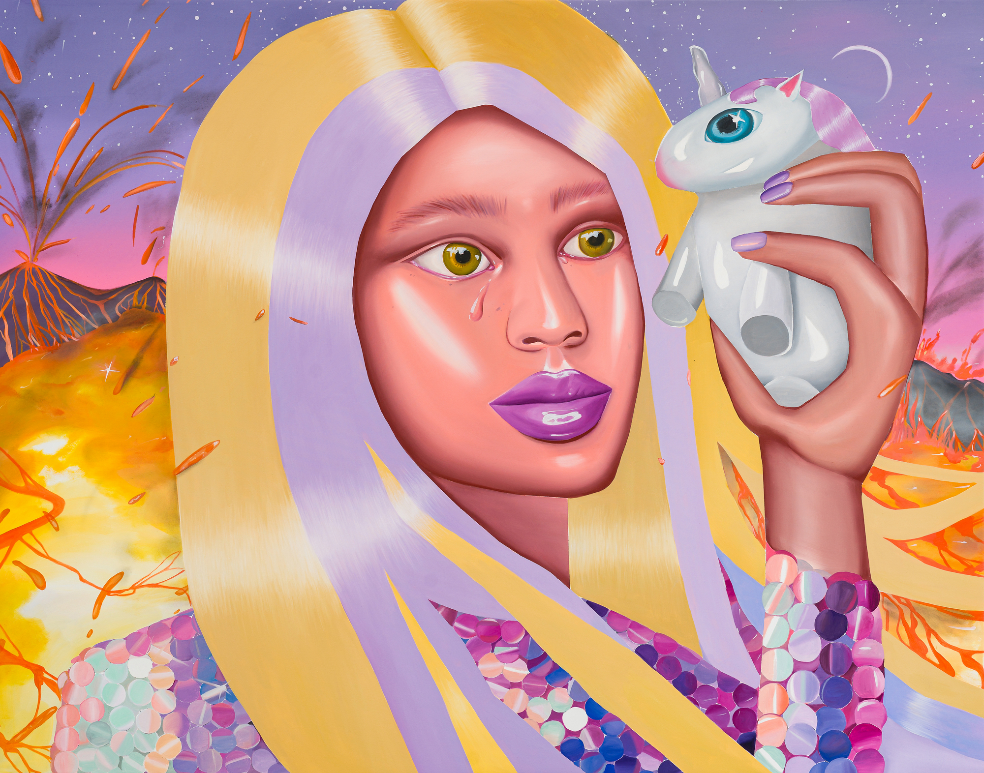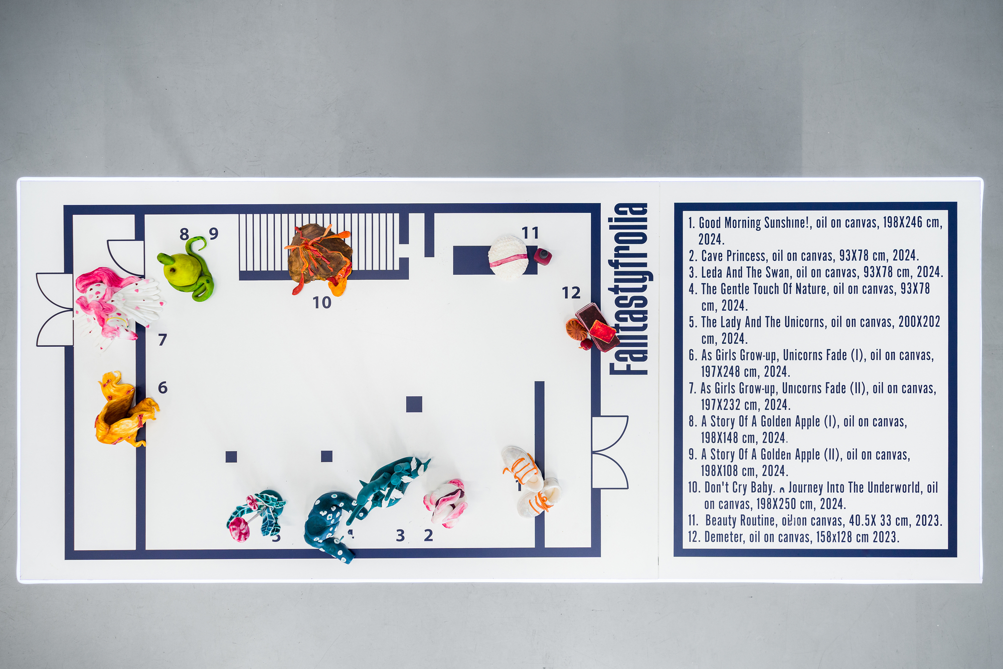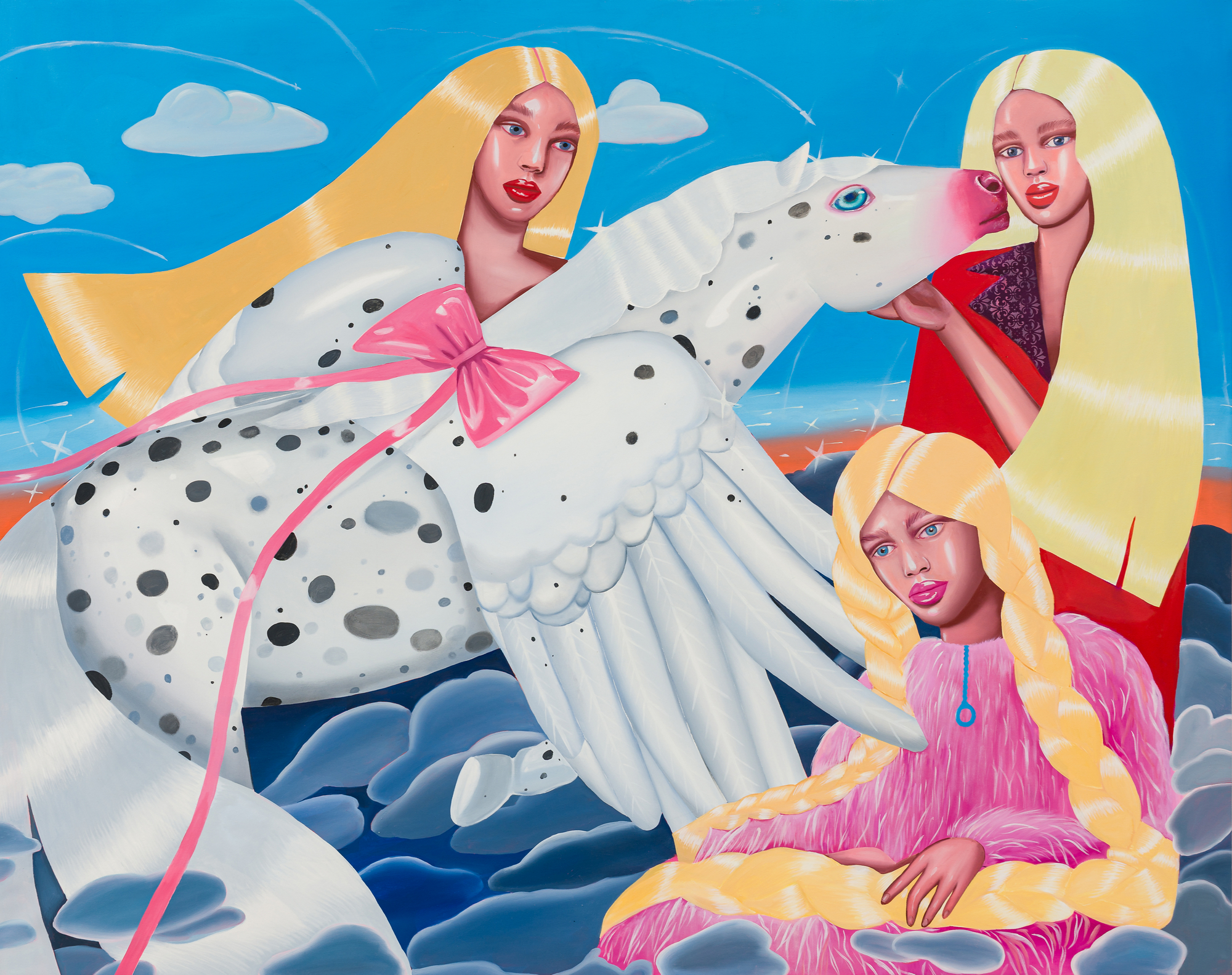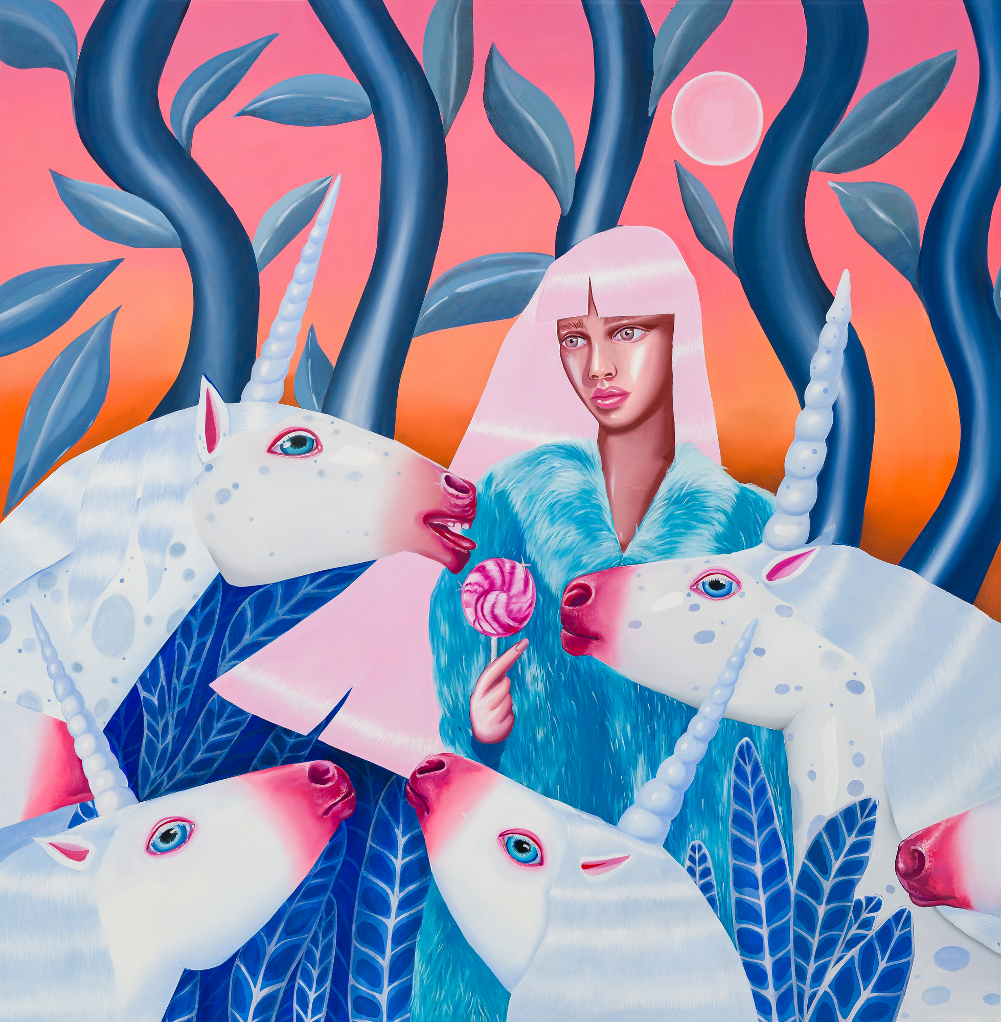 Ioana’s imaginary map thus follows the reverse logic marking the construction of the formation and education novel – the Bildungsroman – whether literary or visual. If, in the Bildungsroman, the main character discovers the unknown and learns to manage the surrounding reality by developing new skills, while following a linear narrative path with a beginning and an ending, in Ioana Băltan’s series, he rediscovers the once-known-now-forgotten by being confronted with childhood sequences subject to the non-logic of emotional memory. The linearity of the narrative is thus pulverized into slivers of memories randomly developed on large surfaces, rendered in oil on canvas. The viewer is served slices of the artist’s emotional archives, the archives of that illo tempore perfectly preserved beneath the flesh of the plastic dolls in the foreground. Ioana Băltan increases the light of her compositions by juxtaposing desaturated and saturated tones. Neapolitan yellow, strontium yellow or thalo crimson pinks gain a high value index in the company of cobalt blue, magenta violet and China green. The rhythm of surfaces worked in ultra-saturated orange tones with burnt shadows and green tones transforms some compositions from static-representational to dynamic-narrative, portraying to viewers doll-like characters in motion. Unexpectedly, the plastic fairies seem to move, thanks to the chromatic associations expressed by the artist. The characters’ broad gestures, the exaltation of flesh through the layering of glaze and the artist’s choice of the generic portrait with exaggerated facial features are all typical manifestations of the dominant Cartoon Glam gene altered by the icon-signs of hyper-feminine aesthetics. A Barbie world conquering the fantasy realms of childhood emerges in shots that look like Instagram selfies. The artist’s careful attention to rendering hair volume by applying thin, elongated and calm brush strokes, as well as the manner in which the garments are treated in subtly textured pastel tones, amplify the femininity of the characters depicted. All the canvases thus become feminine, gaining the quality of frames that are witnesses to the defiance of heteronormative norms and transforming the paintings into a series of confessions of the auctorial ego. Ioana Băltan’s messages go beyond the aestheticization of dolls taking selfies while eating cakes, wearing make-up or riding fluffy unicorns in a flying gallop, and aim at exposing the excessive fetishization of female bodies, a fetishization that starts in early childhood and drives a whole cluster of consumer goods industries, be they toys, pastries, cosmetics or Instagram reels. Text written by Gilda Ghinoiu, curator