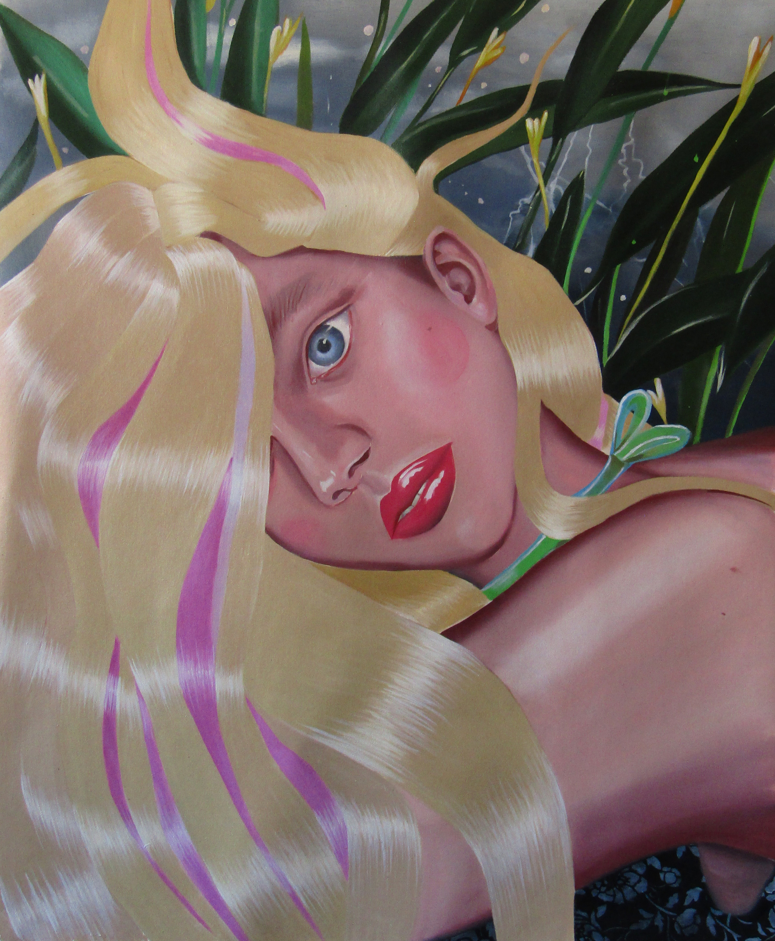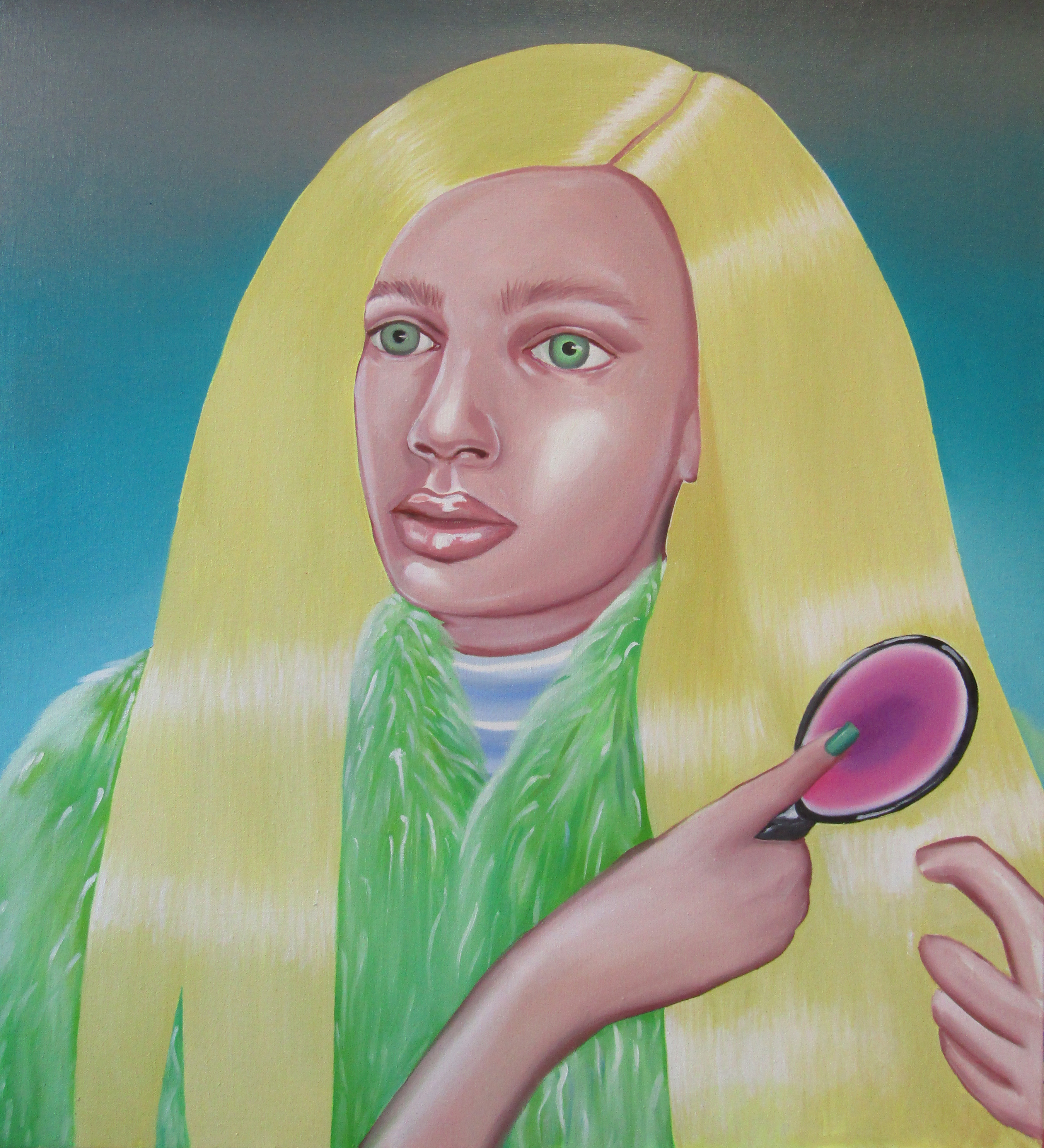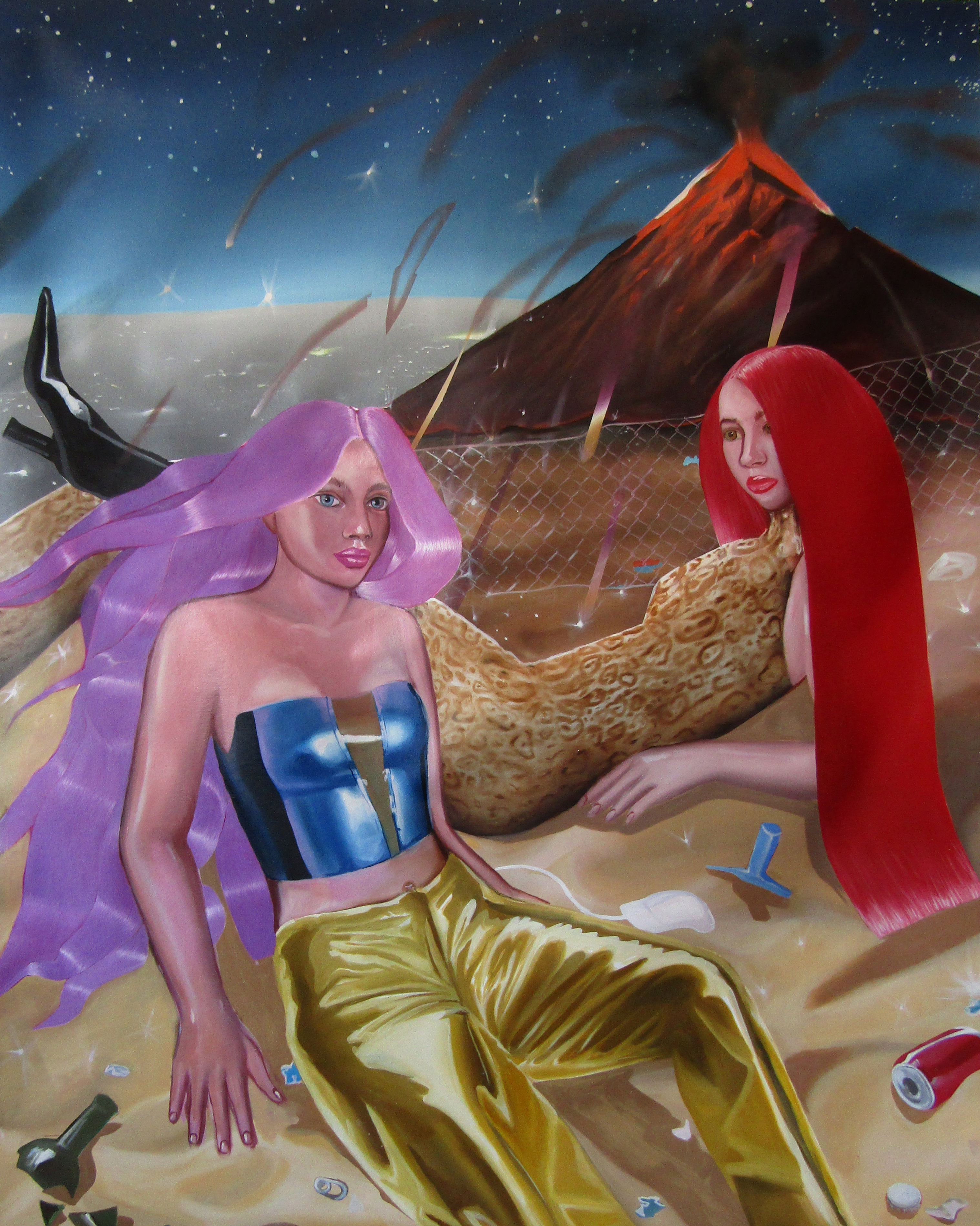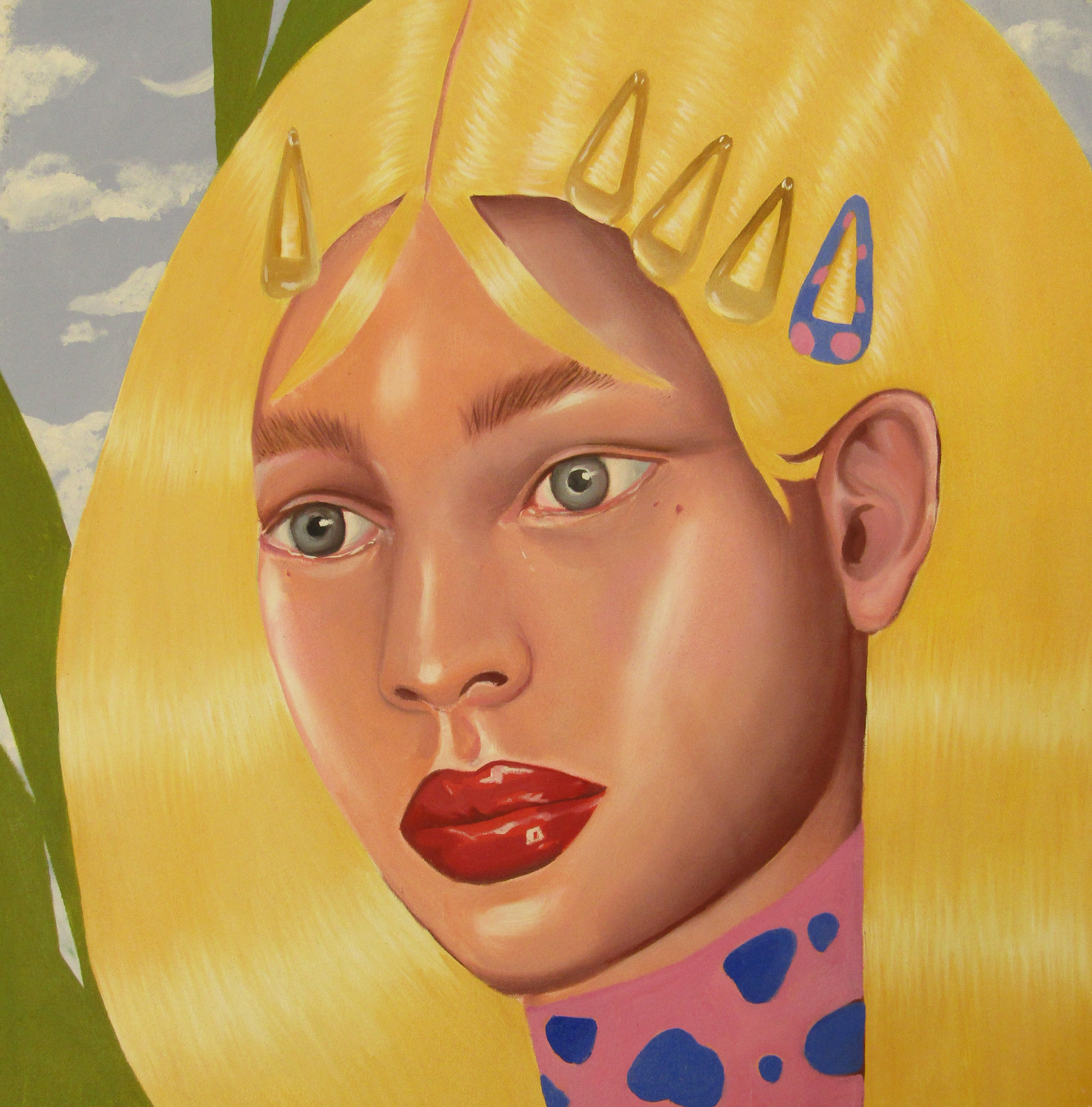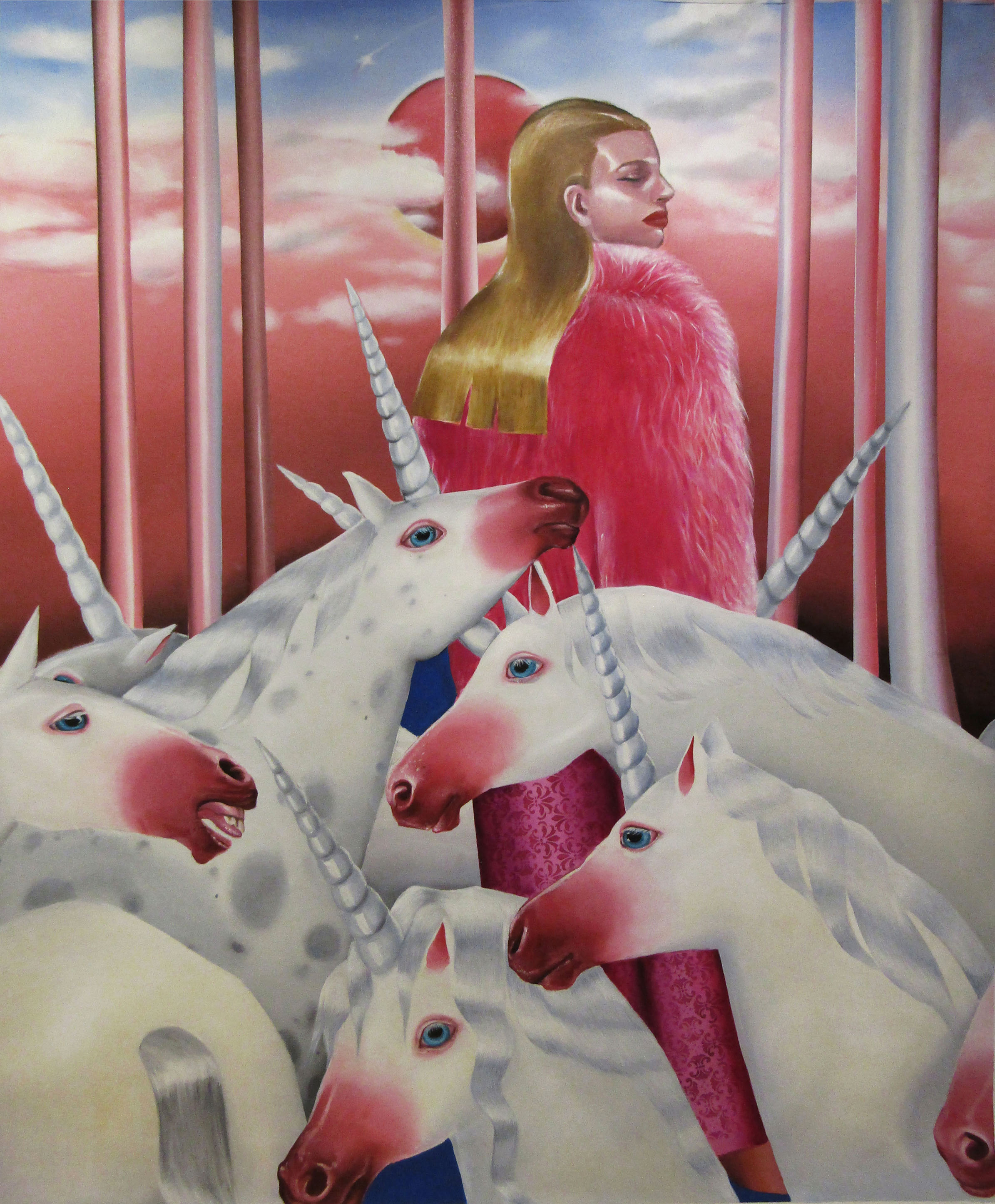 Ioana’s imaginary map thus follows the reverse logic marking the construction of the formation and education novel – the Bildungsroman – whether literary or visual. If, in the Bildungsroman, the main character discovers the unknown and learns to manage the surrounding reality by developing new skills, while following a linear narrative path with a beginning and an ending, in Ioana Băltan’s series, he rediscovers the once-known-now-forgotten by being confronted with childhood sequences subject to the non-logic of emotional memory. The linearity of the narrative is thus pulverized into slivers of memories randomly developed on large surfaces, rendered in oil on canvas. The viewer is served slices of the artist’s emotional archives, the archives of that illo tempore perfectly preserved beneath the flesh of the plastic dolls in the foreground. Ioana Băltan increases the light of her compositions by juxtaposing desaturated and saturated tones. Neapolitan yellow, strontium yellow or thalo crimson pinks gain a high value index in the company of cobalt blue, magenta violet and China green. The rhythm of surfaces worked in ultra-saturated orange tones with burnt shadows and green tones transforms some compositions from static-representational to dynamic-narrative, portraying to viewers doll-like characters in motion. Unexpectedly, the plastic fairies seem to move, thanks to the chromatic associations expressed by the artist. The characters’ broad gestures, the exaltation of flesh through the layering of glaze and the artist’s choice of the generic portrait with exaggerated facial features are all typical manifestations of the dominant Cartoon Glam gene altered by the icon-signs of hyper-feminine aesthetics. A Barbie world conquering the fantasy realms of childhood emerges in shots that look like Instagram selfies. The artist’s careful attention to rendering hair volume by applying thin, elongated and calm brush strokes, as well as the manner in which the garments are treated in subtly textured pastel tones, amplify the femininity of the characters depicted. All the canvases thus become feminine, gaining the quality of frames that are witnesses to the defiance of heteronormative norms and transforming the paintings into a series of confessions of the auctorial ego. Ioana Băltan’s messages go beyond the aestheticization of dolls taking selfies while eating cakes, wearing make-up or riding fluffy unicorns in a flying gallop, and aim at exposing the excessive fetishization of female bodies, a fetishization that starts in early childhood and drives a whole cluster of consumer goods industries, be they toys, pastries, cosmetics or Instagram reels. Text written by Gilda Ghinoiu, curator