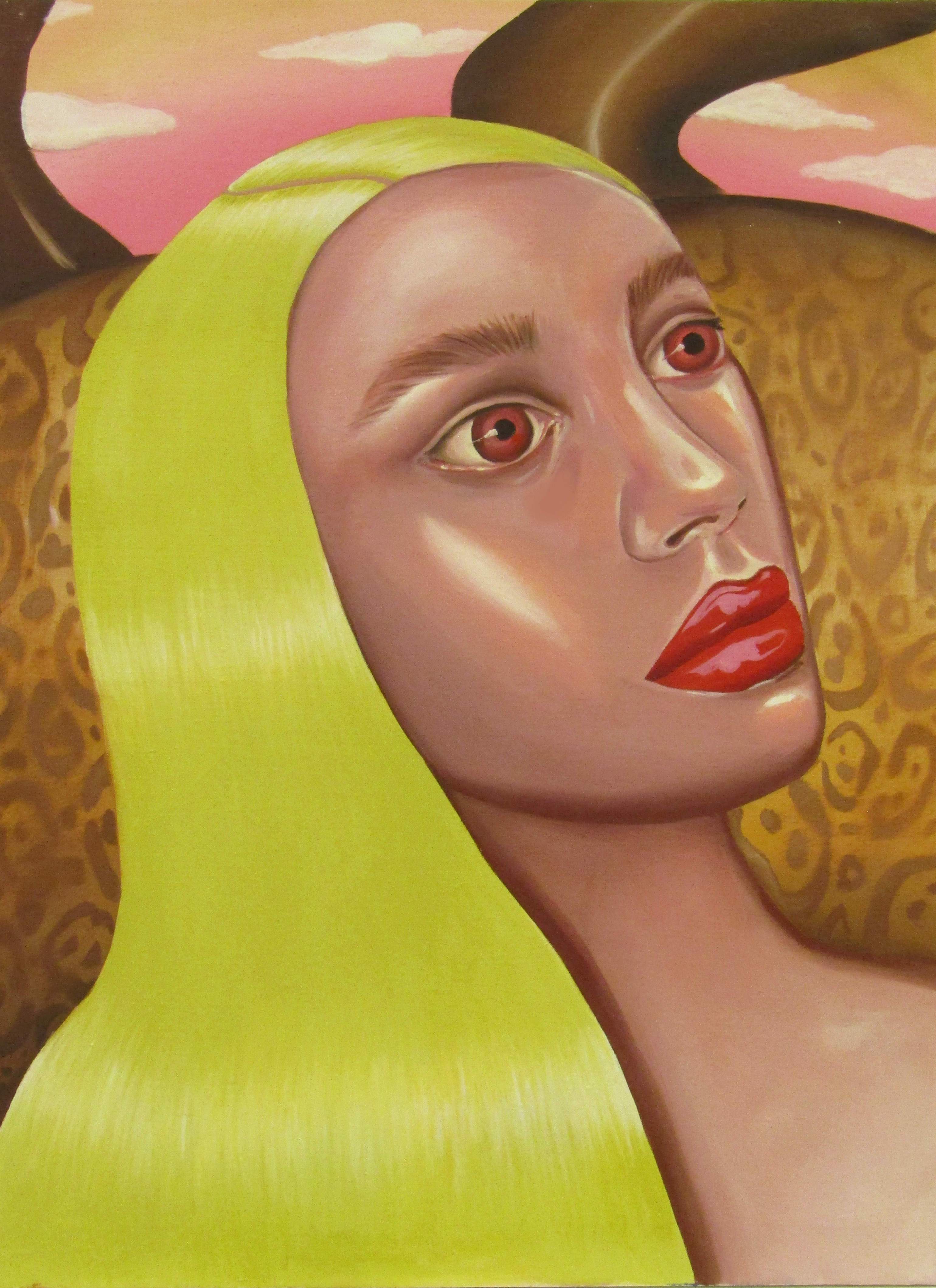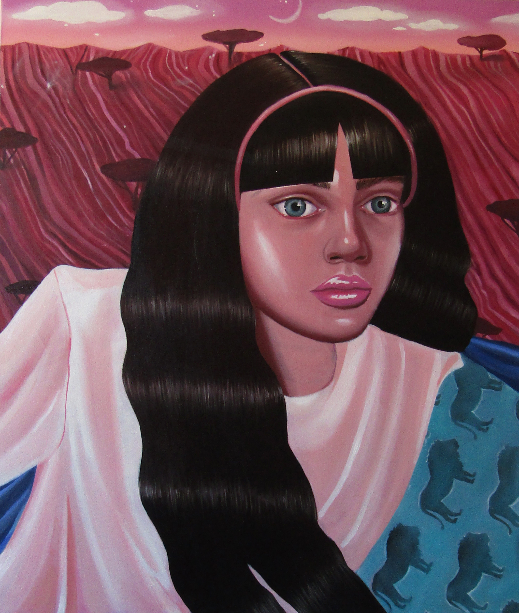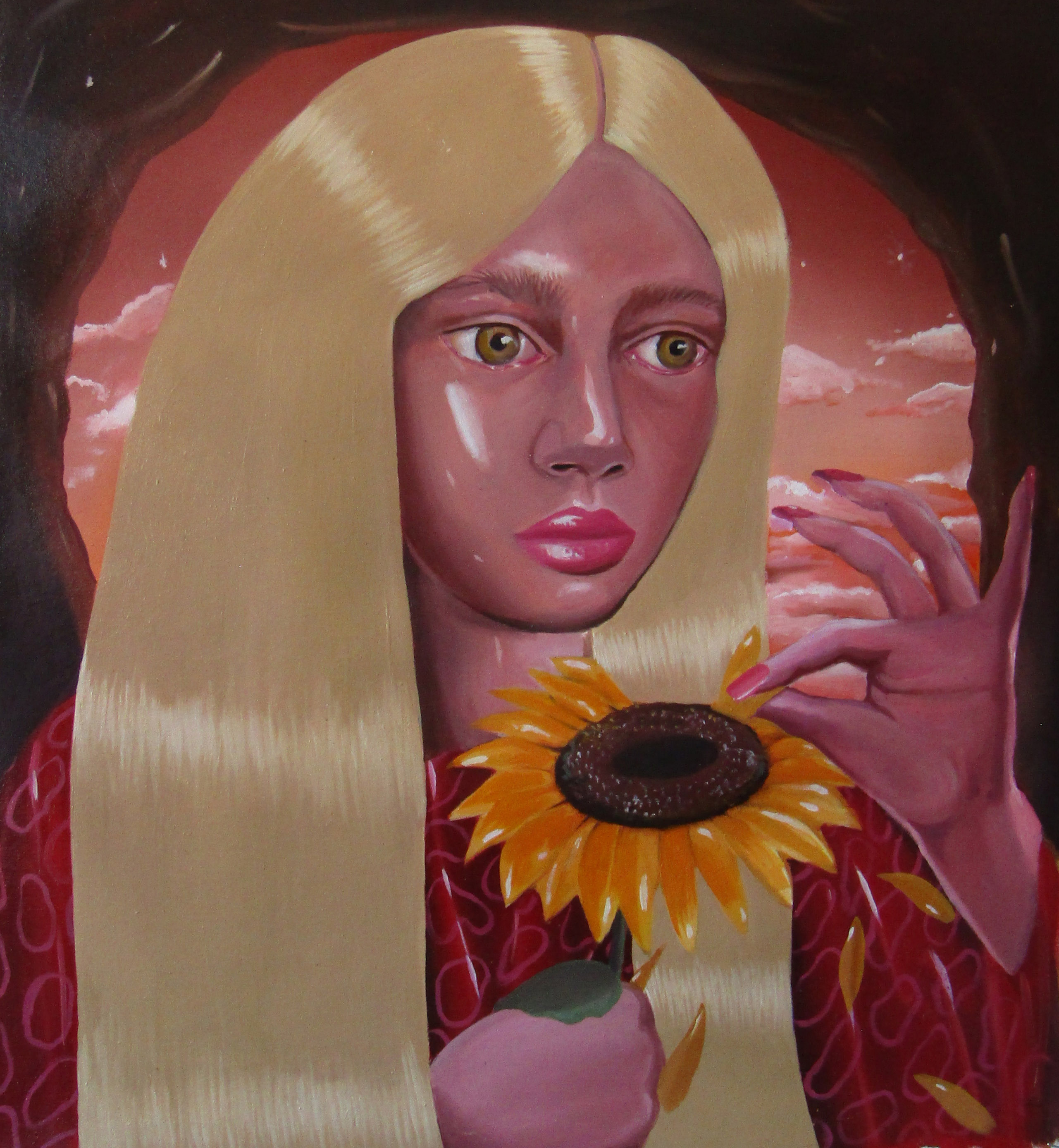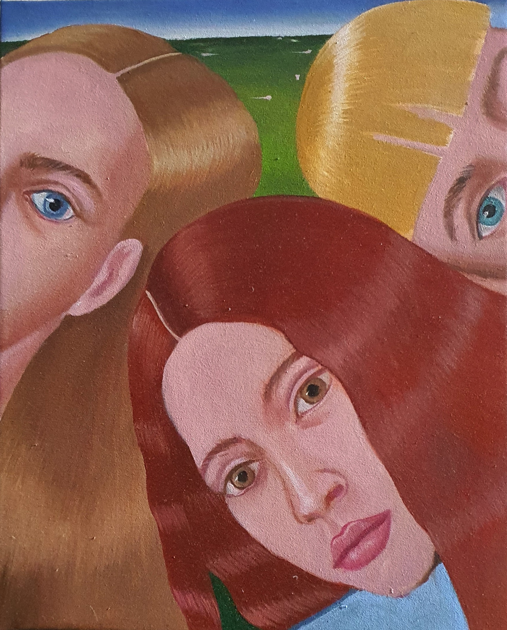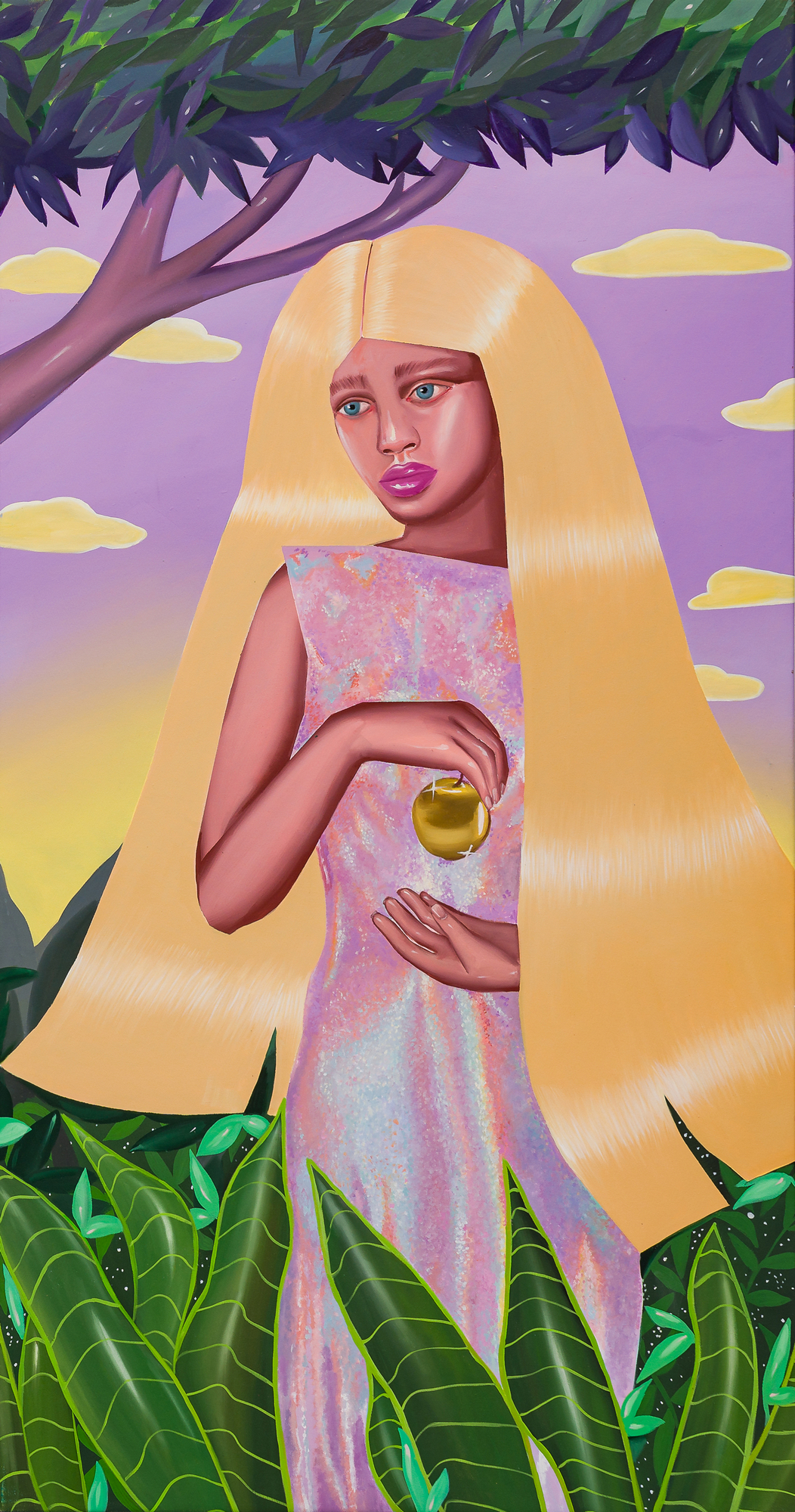 Ioana’s imaginary map thus follows the reverse logic marking the construction of the formation and education novel – the Bildungsroman – whether literary or visual. If, in the Bildungsroman, the main character discovers the unknown and learns to manage the surrounding reality by developing new skills, while following a linear narrative path with a beginning and an ending, in Ioana Băltan’s series, he rediscovers the once-known-now-forgotten by being confronted with childhood sequences subject to the non-logic of emotional memory. The linearity of the narrative is thus pulverized into slivers of memories randomly developed on large surfaces, rendered in oil on canvas. The viewer is served slices of the artist’s emotional archives, the archives of that illo tempore perfectly preserved beneath the flesh of the plastic dolls in the foreground. Ioana Băltan increases the light of her compositions by juxtaposing desaturated and saturated tones. Neapolitan yellow, strontium yellow or thalo crimson pinks gain a high value index in the company of cobalt blue, magenta violet and China green. The rhythm of surfaces worked in ultra-saturated orange tones with burnt shadows and green tones transforms some compositions from static-representational to dynamic-narrative, portraying to viewers doll-like characters in motion. Unexpectedly, the plastic fairies seem to move, thanks to the chromatic associations expressed by the artist. The characters’ broad gestures, the exaltation of flesh through the layering of glaze and the artist’s choice of the generic portrait with exaggerated facial features are all typical manifestations of the dominant Cartoon Glam gene altered by the icon-signs of hyper-feminine aesthetics. A Barbie world conquering the fantasy realms of childhood emerges in shots that look like Instagram selfies. The artist’s careful attention to rendering hair volume by applying thin, elongated and calm brush strokes, as well as the manner in which the garments are treated in subtly textured pastel tones, amplify the femininity of the characters depicted. All the canvases thus become feminine, gaining the quality of frames that are witnesses to the defiance of heteronormative norms and transforming the paintings into a series of confessions of the auctorial ego. Ioana Băltan’s messages go beyond the aestheticization of dolls taking selfies while eating cakes, wearing make-up or riding fluffy unicorns in a flying gallop, and aim at exposing the excessive fetishization of female bodies, a fetishization that starts in early childhood and drives a whole cluster of consumer goods industries, be they toys, pastries, cosmetics or Instagram reels. Text written by Gilda Ghinoiu, curator