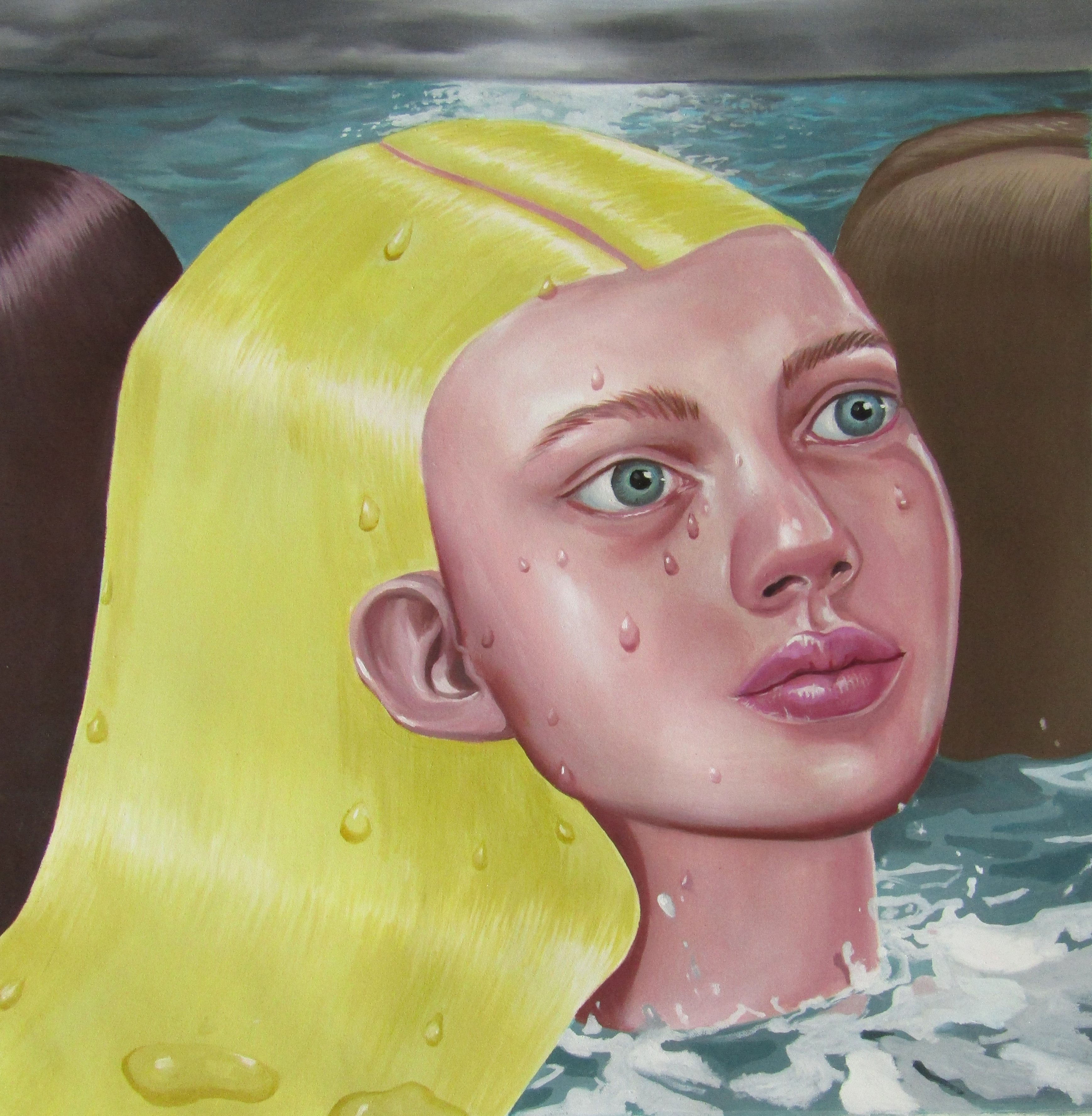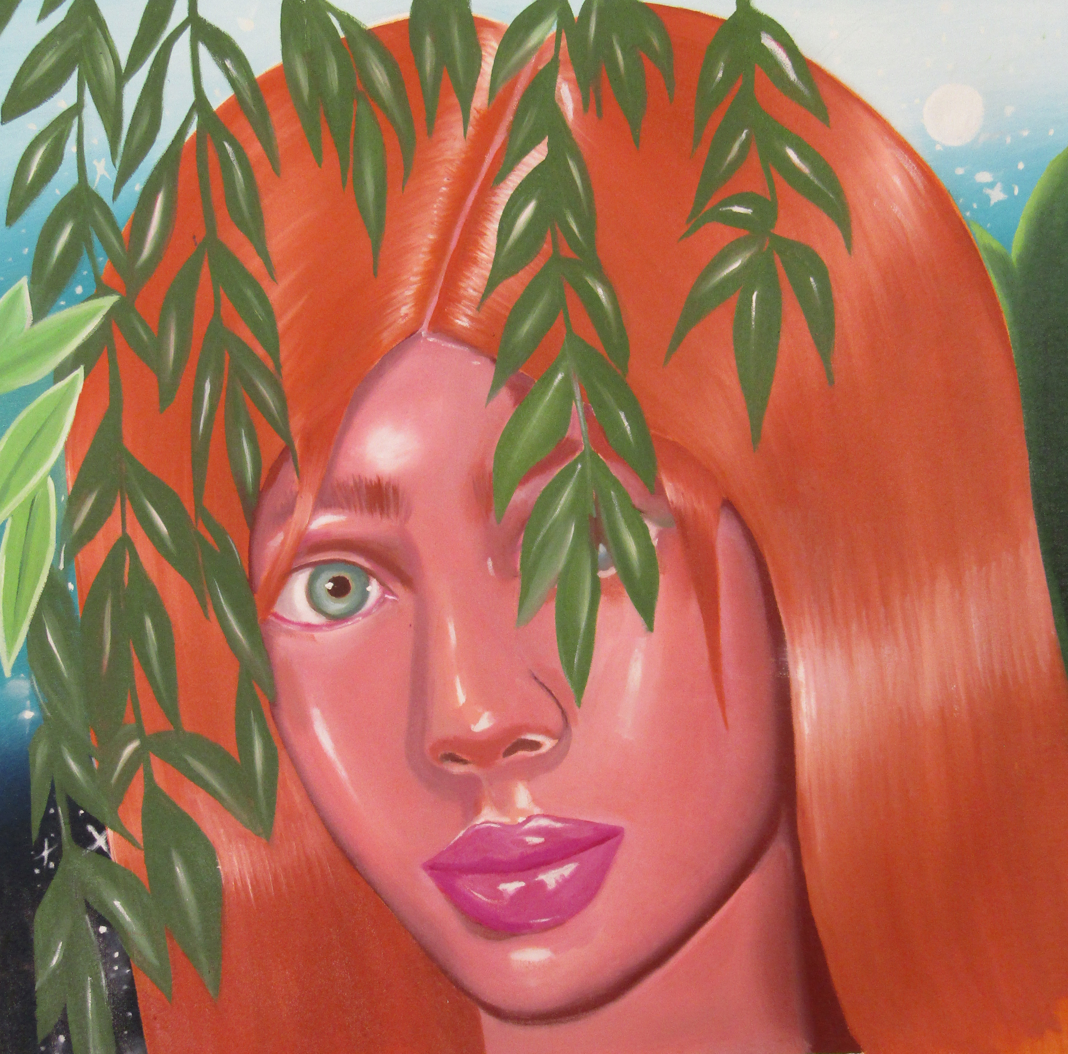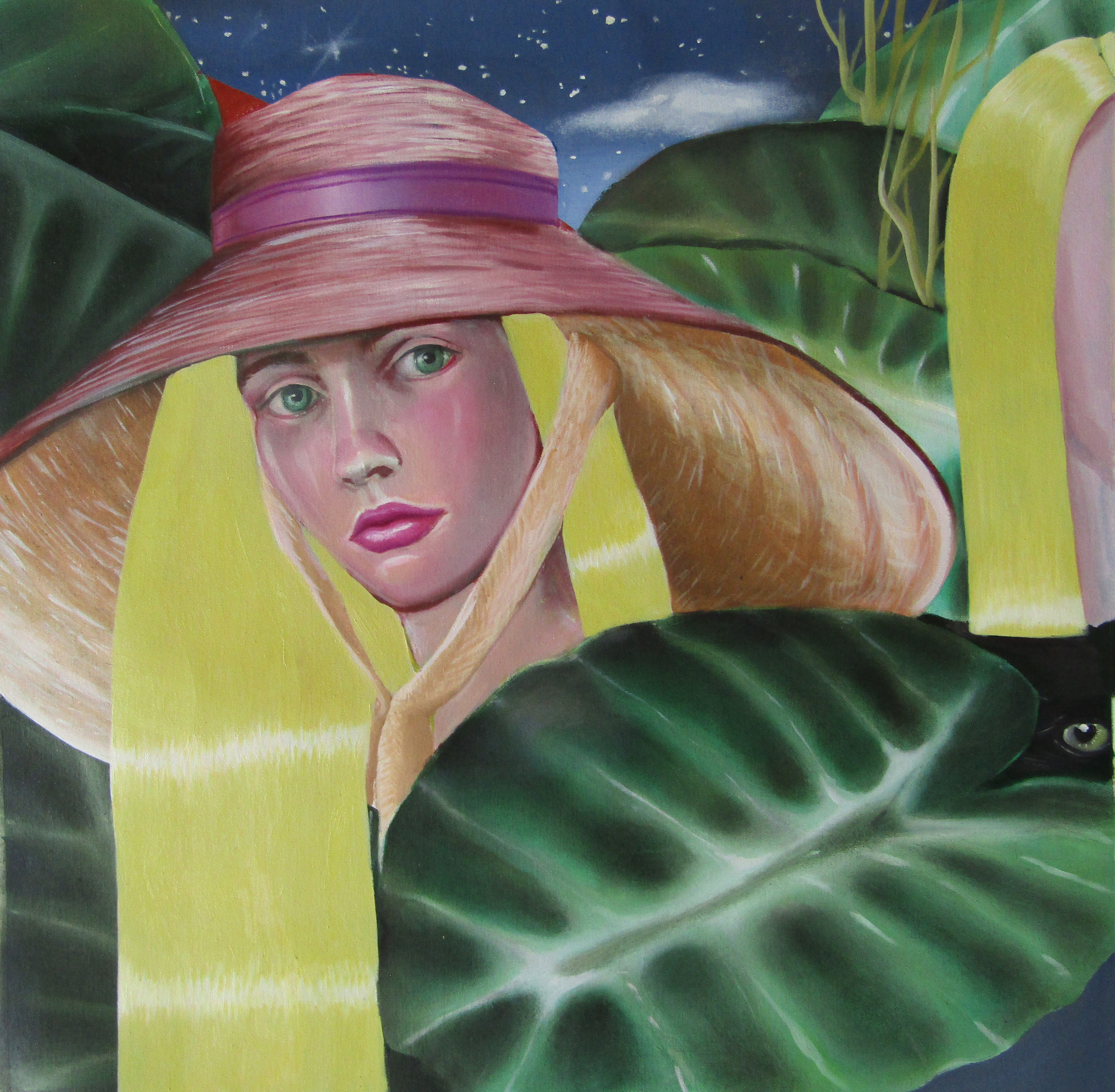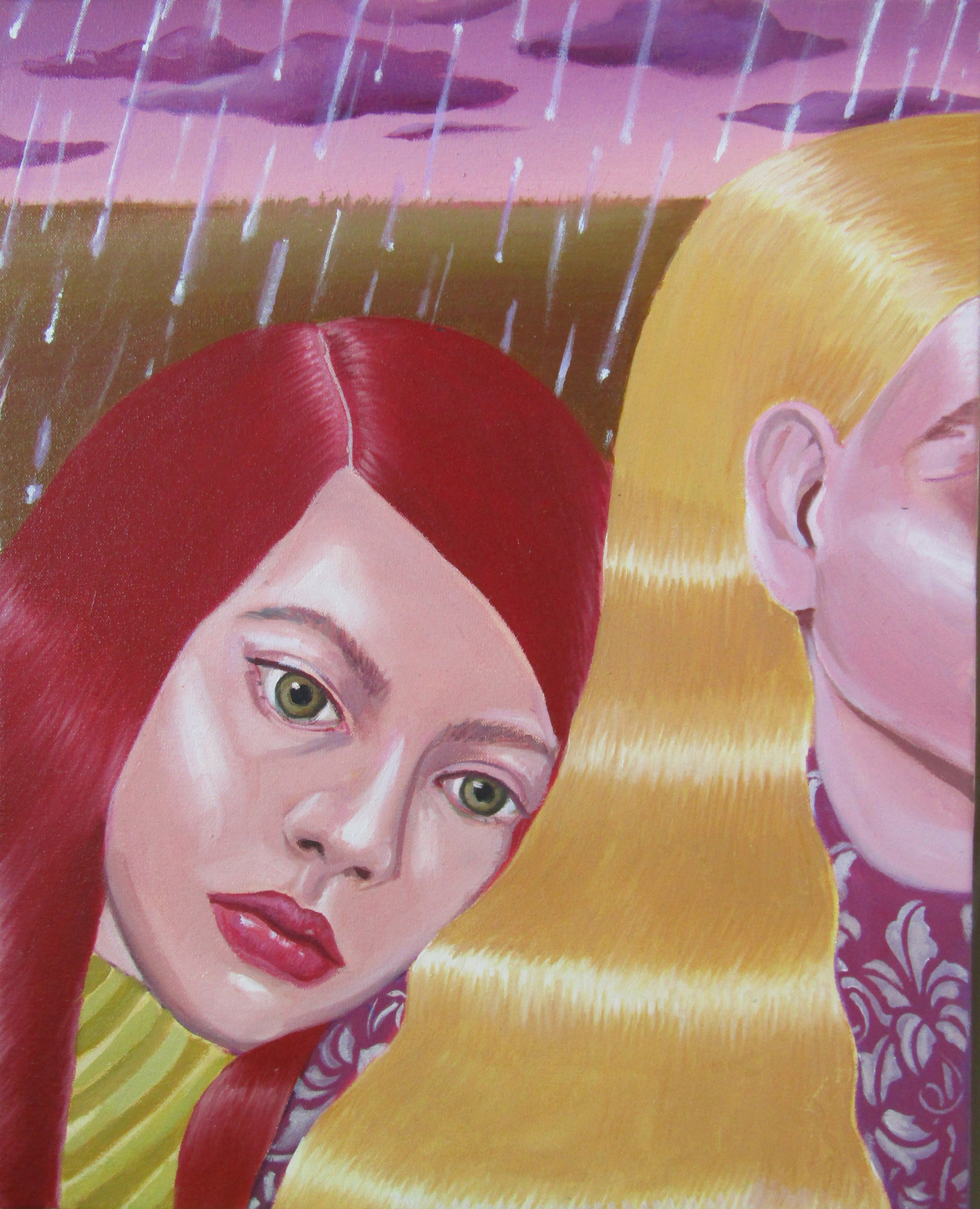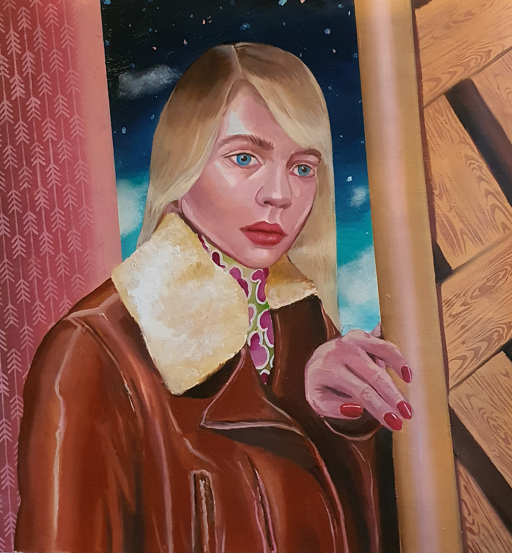 Ioana’s imaginary map thus follows the reverse logic marking the construction of the formation and education novel – the Bildungsroman – whether literary or visual. If, in the Bildungsroman, the main character discovers the unknown and learns to manage the surrounding reality by developing new skills, while following a linear narrative path with a beginning and an ending, in Ioana Băltan’s series, he rediscovers the once-known-now-forgotten by being confronted with childhood sequences subject to the non-logic of emotional memory. The linearity of the narrative is thus pulverized into slivers of memories randomly developed on large surfaces, rendered in oil on canvas. The viewer is served slices of the artist’s emotional archives, the archives of that illo tempore perfectly preserved beneath the flesh of the plastic dolls in the foreground. Ioana Băltan increases the light of her compositions by juxtaposing desaturated and saturated tones. Neapolitan yellow, strontium yellow or thalo crimson pinks gain a high value index in the company of cobalt blue, magenta violet and China green. The rhythm of surfaces worked in ultra-saturated orange tones with burnt shadows and green tones transforms some compositions from static-representational to dynamic-narrative, portraying to viewers doll-like characters in motion. Unexpectedly, the plastic fairies seem to move, thanks to the chromatic associations expressed by the artist. The characters’ broad gestures, the exaltation of flesh through the layering of glaze and the artist’s choice of the generic portrait with exaggerated facial features are all typical manifestations of the dominant Cartoon Glam gene altered by the icon-signs of hyper-feminine aesthetics. A Barbie world conquering the fantasy realms of childhood emerges in shots that look like Instagram selfies. The artist’s careful attention to rendering hair volume by applying thin, elongated and calm brush strokes, as well as the manner in which the garments are treated in subtly textured pastel tones, amplify the femininity of the characters depicted. All the canvases thus become feminine, gaining the quality of frames that are witnesses to the defiance of heteronormative norms and transforming the paintings into a series of confessions of the auctorial ego. Ioana Băltan’s messages go beyond the aestheticization of dolls taking selfies while eating cakes, wearing make-up or riding fluffy unicorns in a flying gallop, and aim at exposing the excessive fetishization of female bodies, a fetishization that starts in early childhood and drives a whole cluster of consumer goods industries, be they toys, pastries, cosmetics or Instagram reels. Text written by Gilda Ghinoiu, curator